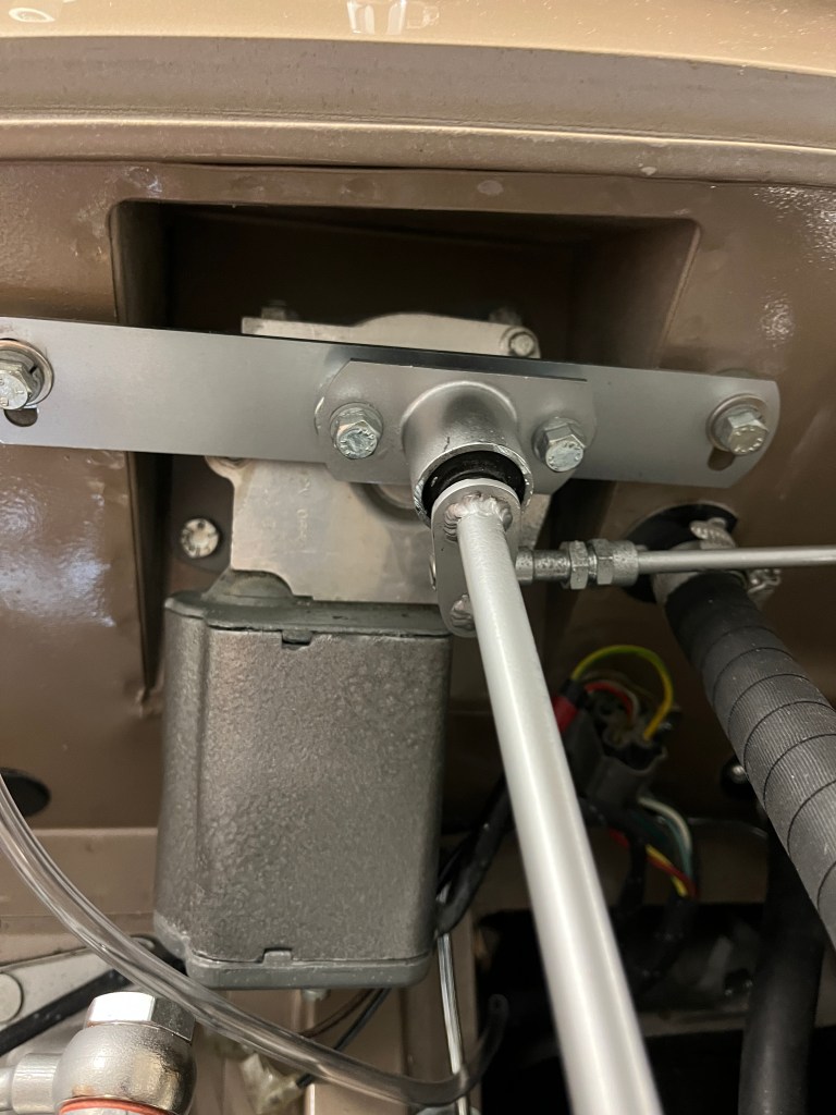 BTW both of these rods will accept a minor amount of length adjustement. Also if you look closely at the bellcrank, you will note that there are two spacers with wrench flats. The internal hole in the spacers is eccentric. In concept, you can rotate the spacers and obtain a modest change in the rotational position of the bellcrank. What you do not want to have happen is for the bellcrank to rotate “overcenter”, as then it gets stuck. Overcenter would be defined as the bellcrank rotating CCW such that the long rod is at or below the 9 o’clock position.