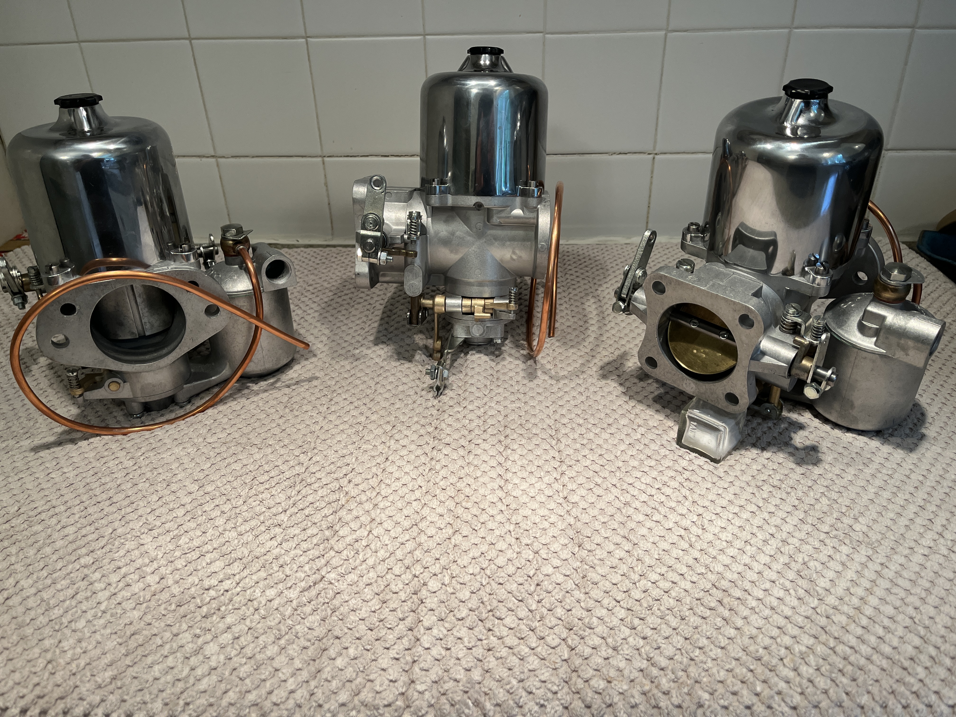 Last but not least, the condition of the SU carbs can play a big part in how well your overall linkage responds to throttle inputs. Here are 3 freshly rebuilt by Joe Curto SU carbs for my 3.8 car. On the right hand carb you can see the “butterfly” which is at the end of this long path of linkages. As the butterfly rotates, it allows more airflow. The SU carb cleverly takes care of adding the additional gasoline required to allow your engine to rev. Google “constant depression carburator”. Anyway, the shaft that the butterfly rides on must be in good condition or it can bind. Joe Curto offers a rebuilding service for just the throttle shafts at a reasonable price. These carbs have received his full restoration service and are a joy to look at.