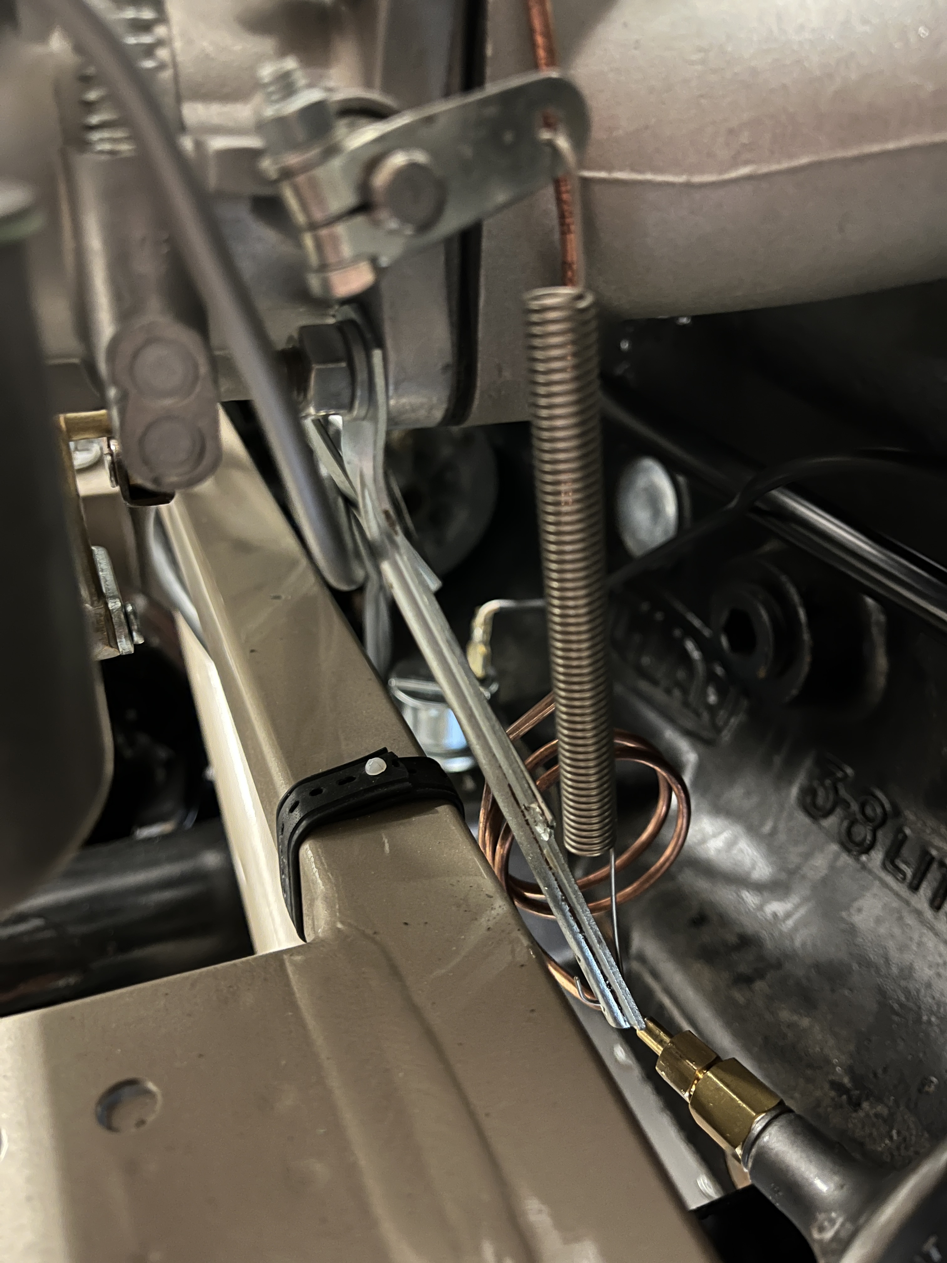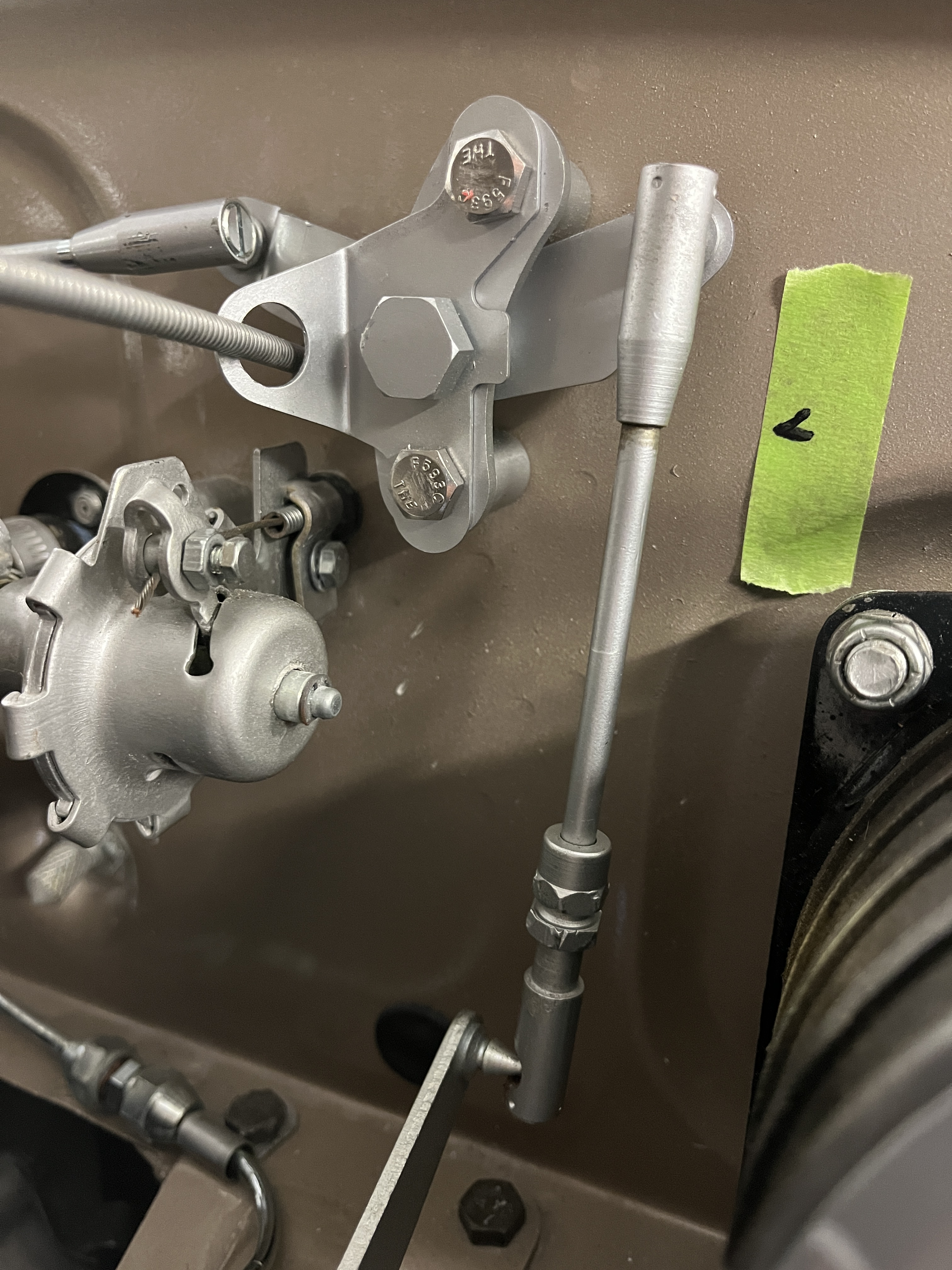 BTW both of these rods will accept a minor amount of length adjustement. Also if you look closely at the bellcrank, you will note that there are two spacers with wrench flats. The internal hole in the spacers is eccentric. In concept, you can rotate the spacers and obtain a modest change in the rotational position of the bellcrank. What you do not want to have happen is for the bellcrank to rotate “overcenter”, as then it gets stuck. Overcenter would be defined as the bellcrank rotating CCW such that the long rod is at or below the 9 o’clock position.