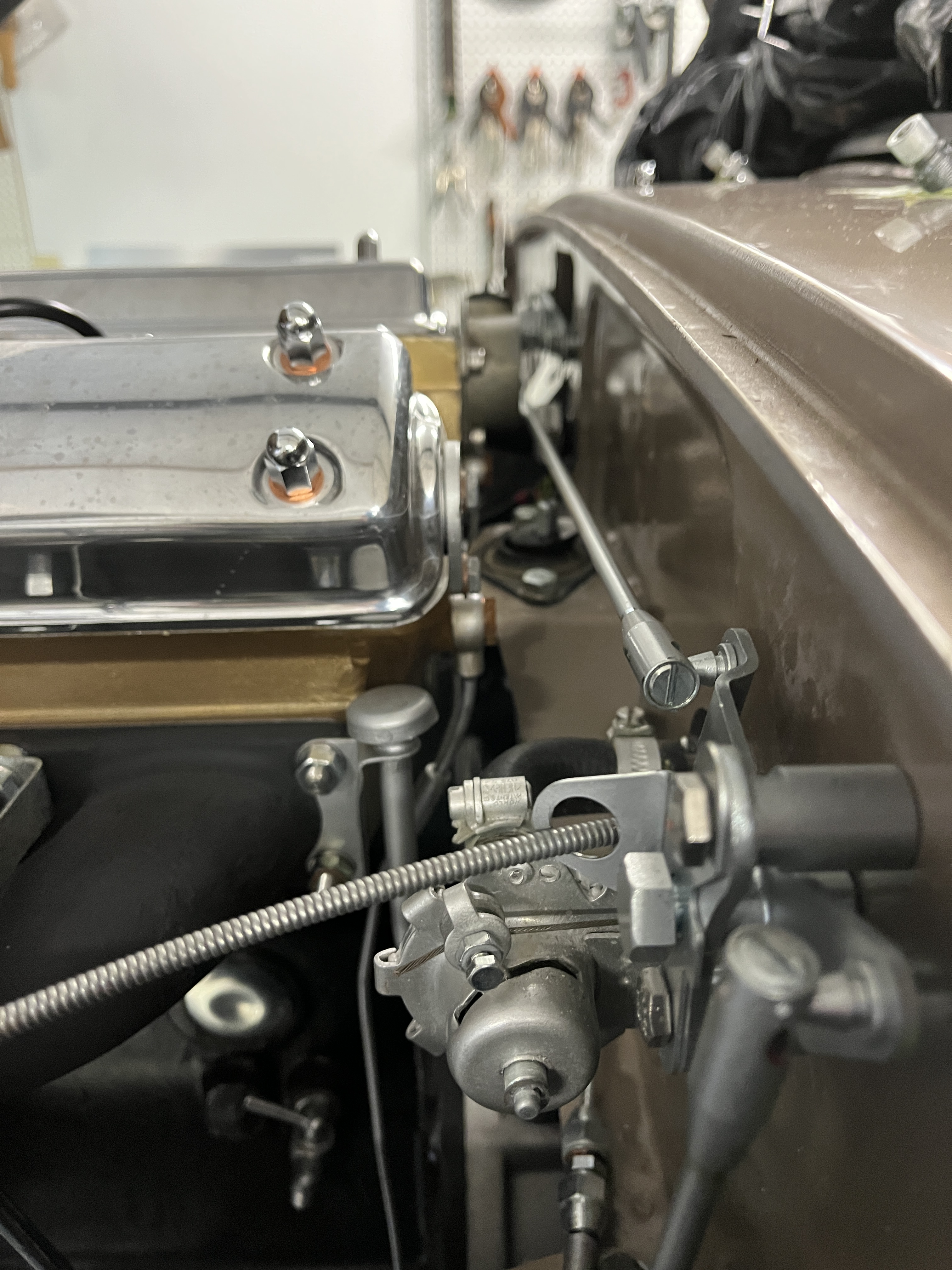 This bellcrank is mounted on the firewall, between the heater valve and the brake vacuum booster. From there, a long rod traverses the area behind the engine. It goes without saying that the rod should have a modest clearance to adjacent items so that it does not foul.