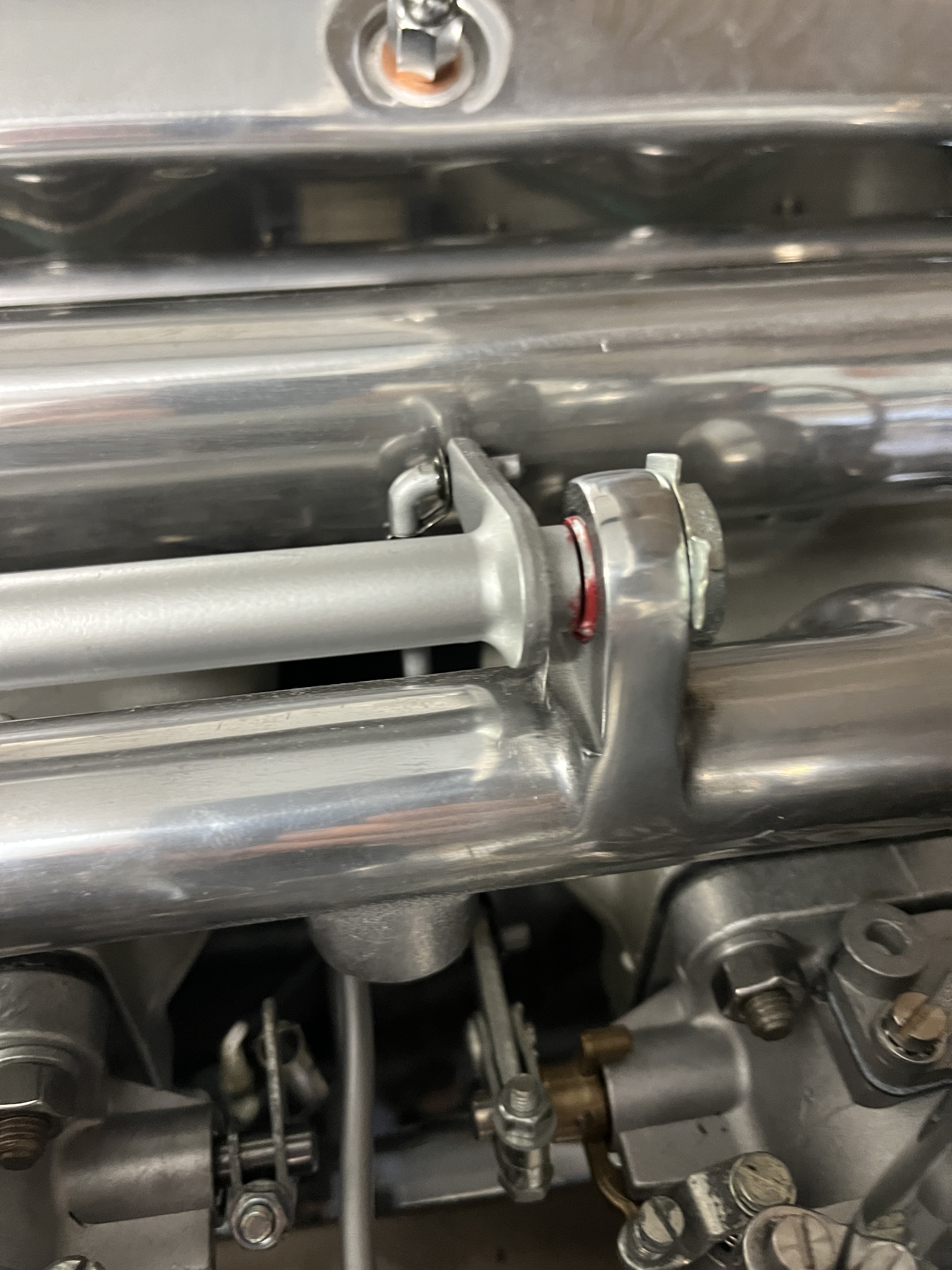 At this point, the translational action of the long rod is converted to rotation of the shaft that passes over the manifold. As we will see in a second, there are 3 levers on this shaft that convert the rotation back to translation, pushing on the throttle arms of each SU carburator. There are several places in the shaft to check for binding.