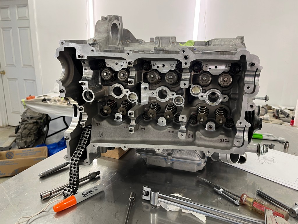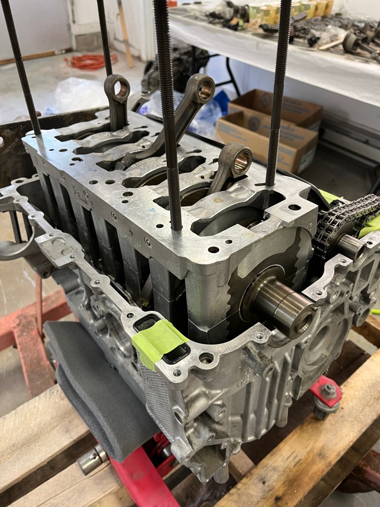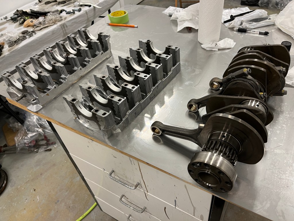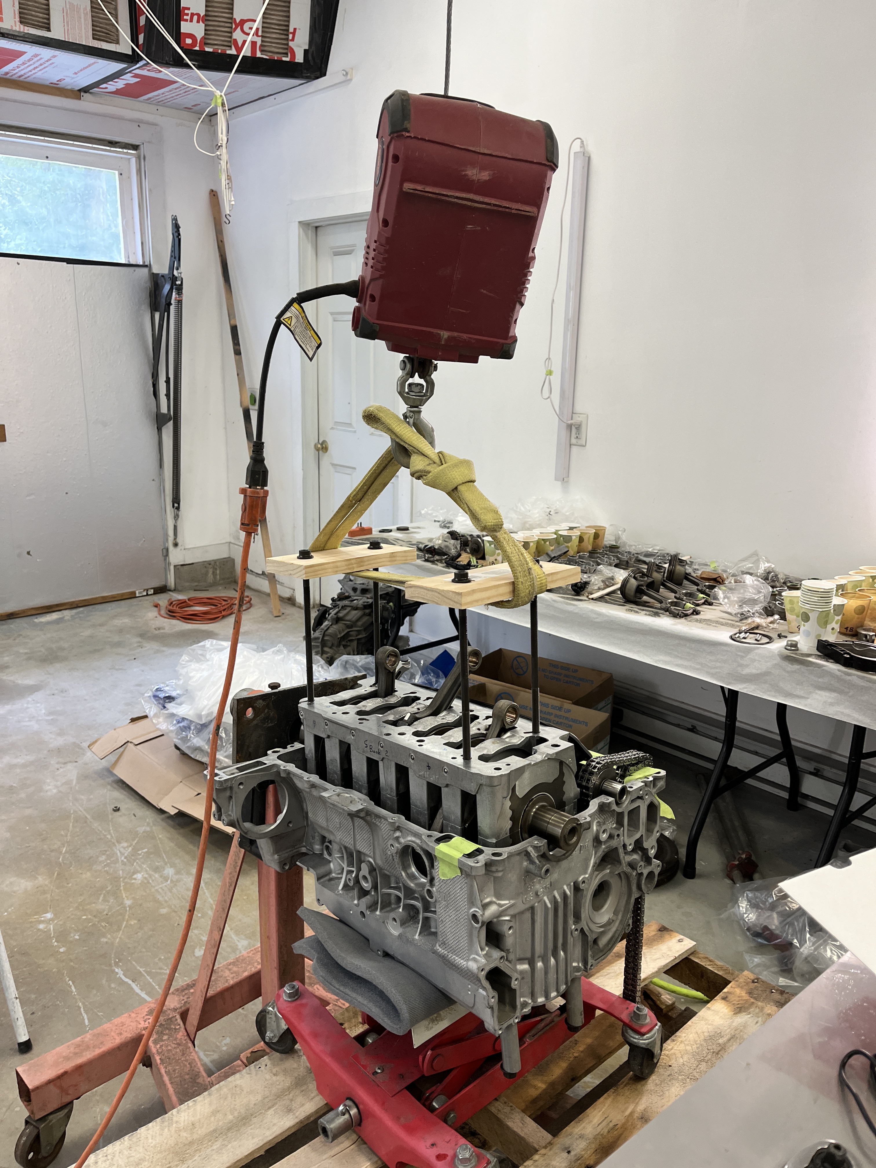 So with that as a backdrop, I watched the video last spring (full running time is many hours) to get a general familiarity of what I was up against. Then I selected my machine shop, Slakker Racing Development (SRD), and got that effort underway. That included an order for the bulk of my rebuild and upgrade parts package. When the parts and machine work arrived, I repurposed my paint bay into an engine build bay. This was an easy switch, as the paint bay is basically a clean, well lit, heated and cooled garage bay. It was perfect for building an engine. I moved a cabinet into the middle of the room and topped it with a sheet of stainless steel plate that I had squirrelled away. BTW, the stainless steel plate makes a perfect work surface as it is smooth and can be wiped down early and often to keep that work area as clean as possible. I rigged an electrical hoist, which serves as the “second person” that Jake calls for in some cases. I also brought in an engine stand.