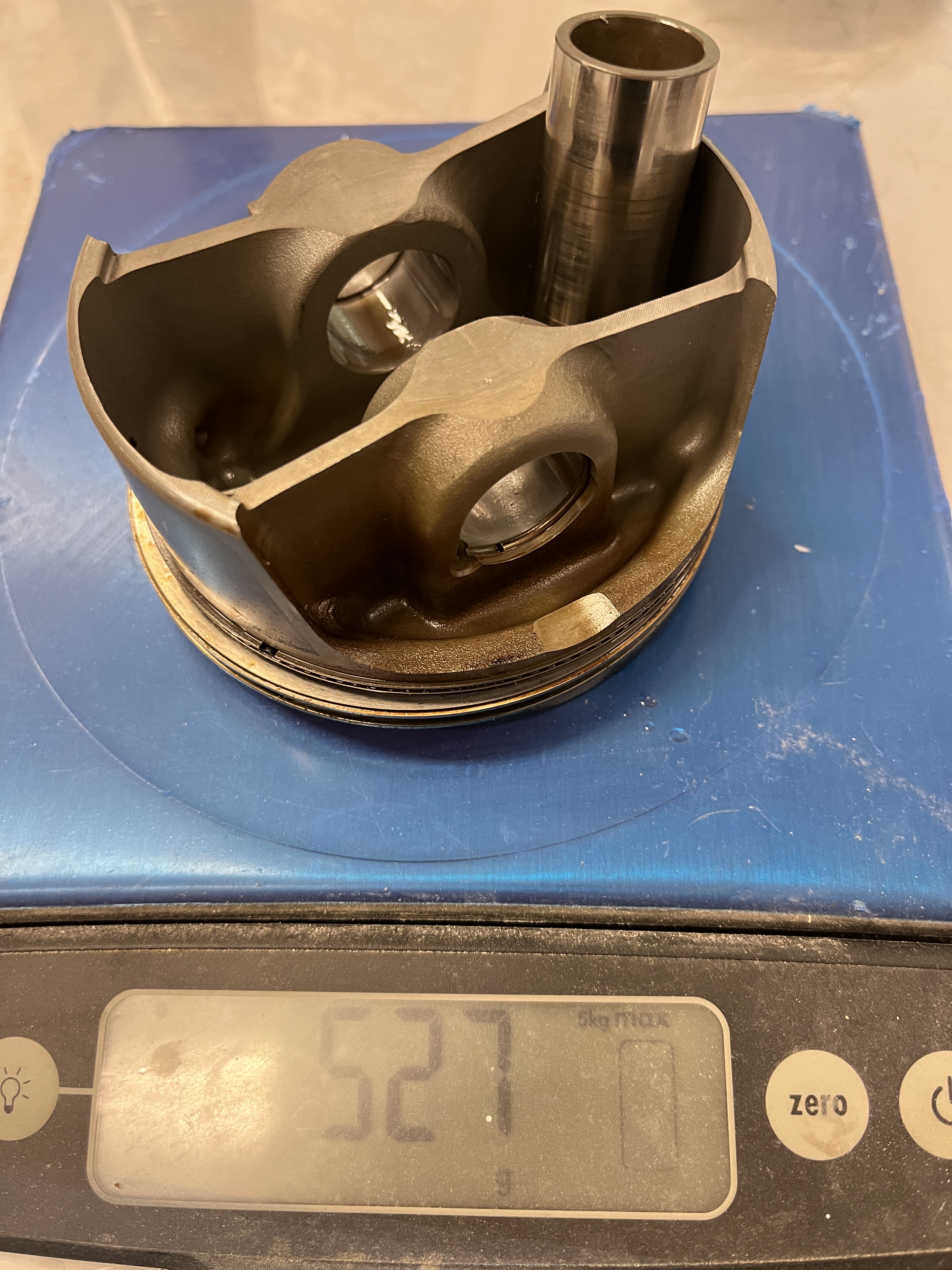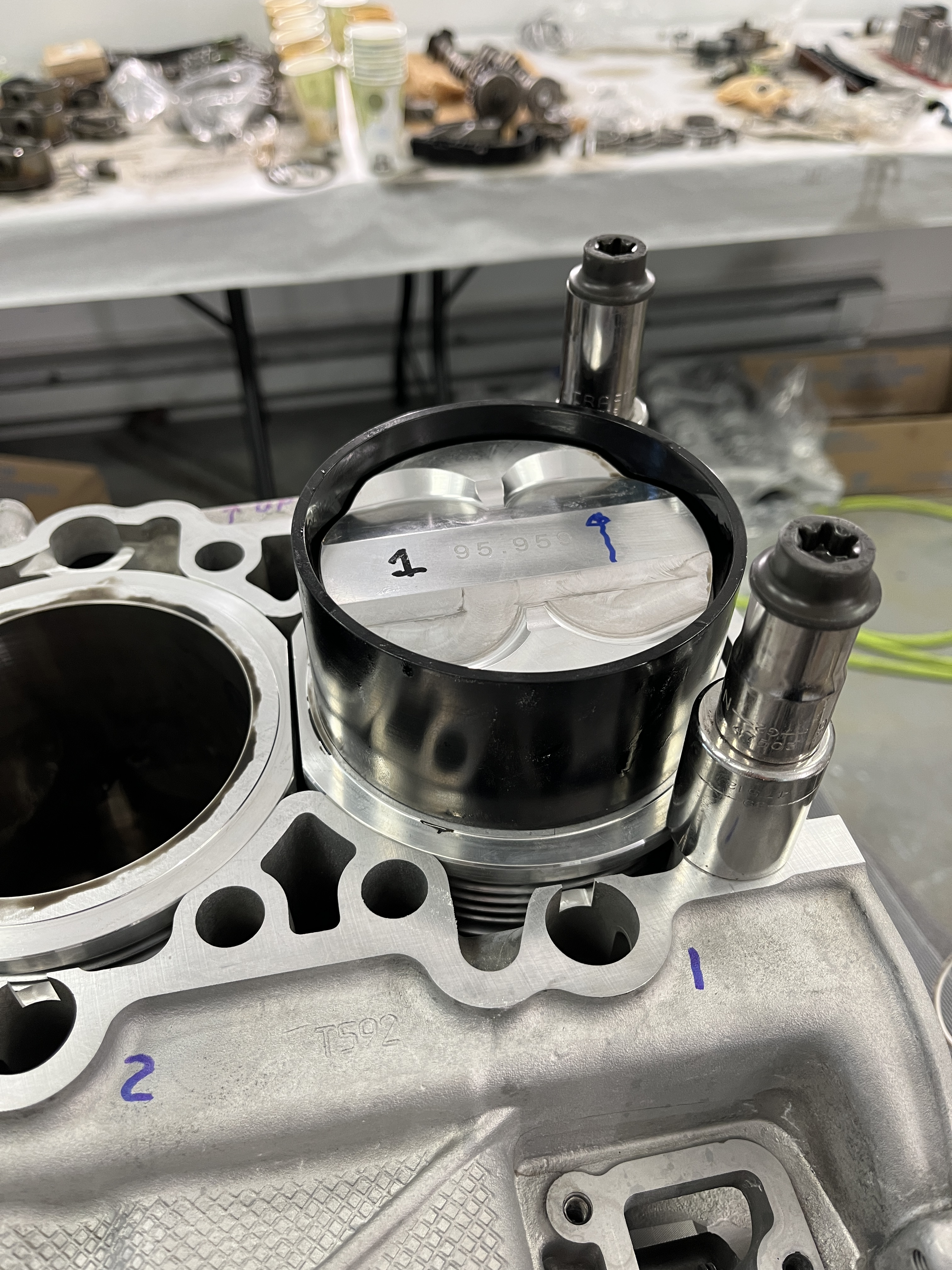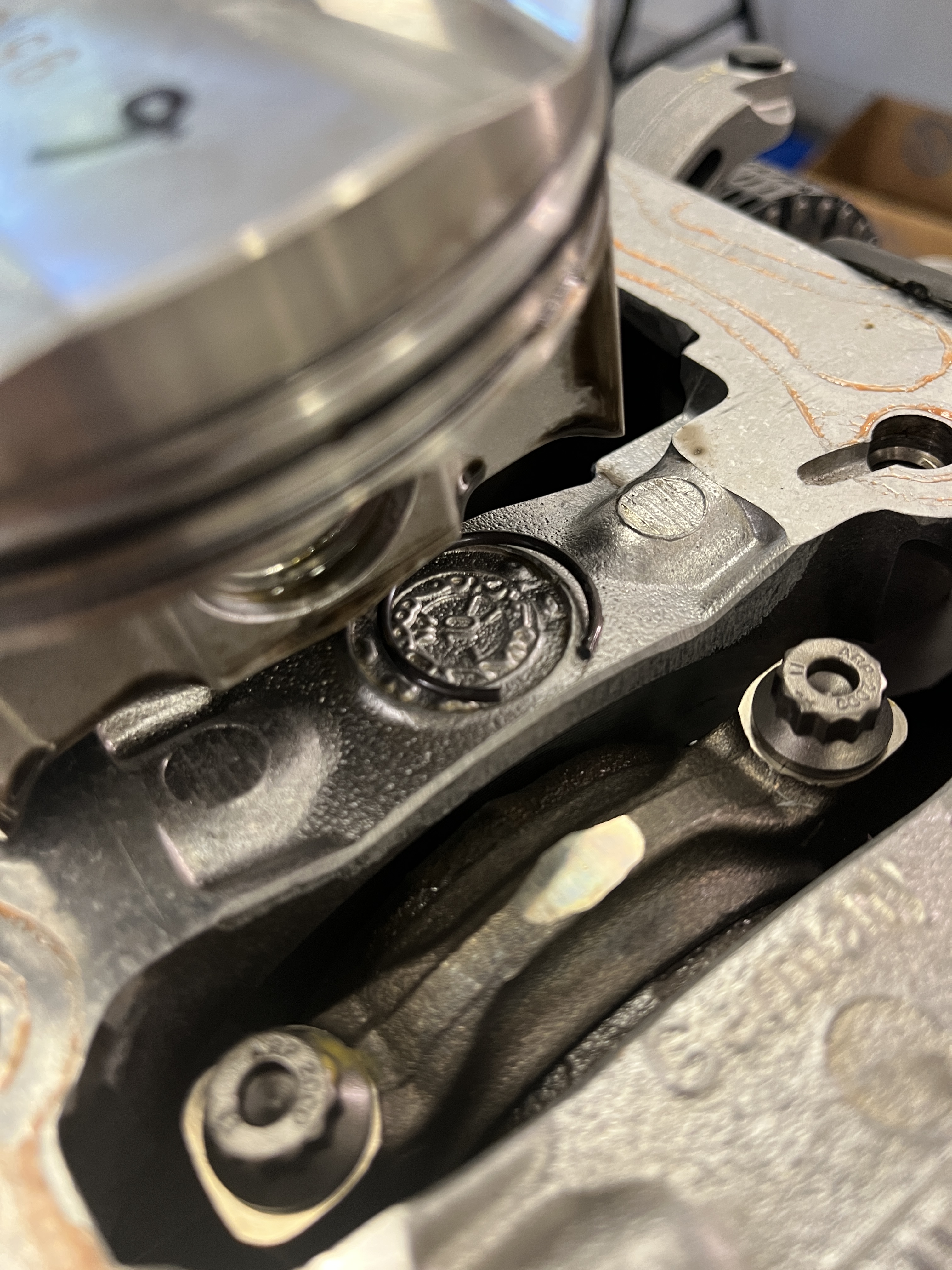 - Fitting piston pin circlips. Jake’s video does a good job of explaining how to use the factory tool to load and install a piston pin circlip into a piston. In his discussion, he is using a piston with a counterbore at the piston pin hole, where the tool is engaged and centered. I noted that the proprietary Hartech pistons only have a counterbore on one side, just like the factory pistons. On the side without a counterbore, the factory tool will not work directly. I scratched my head over this but the light bulb finally came only. Insertion is similar to that used with the factory tool. Instead of squeezing the circlip into the opening of the insertion tube, roughly perpendicular to its final orientation, you squeeze the circlip into the opening in the side of the piston, using your fingers. It takes some force! The clip will of course be rotated in the hole. Then you use the rod of the insertion tool, which is sized to fit inside the piston pin hole, to gradually rotate the circlip until it lines up and snaps into the groove. I wound up inserting the rod several times from both sides as required to rotate the circlip into position. As an aside, on bank 2, where you will be using the piston pin and circlip insertion tool through the small access openings in the block, installing the pistons in their proper “up” position will place the counterbore on the correct side. For the Hartech pistons, “up” is simply with the large etched size designations facing up. Be careful to check your work because if you get this backward you won’t be able to install the piston pin circlips.