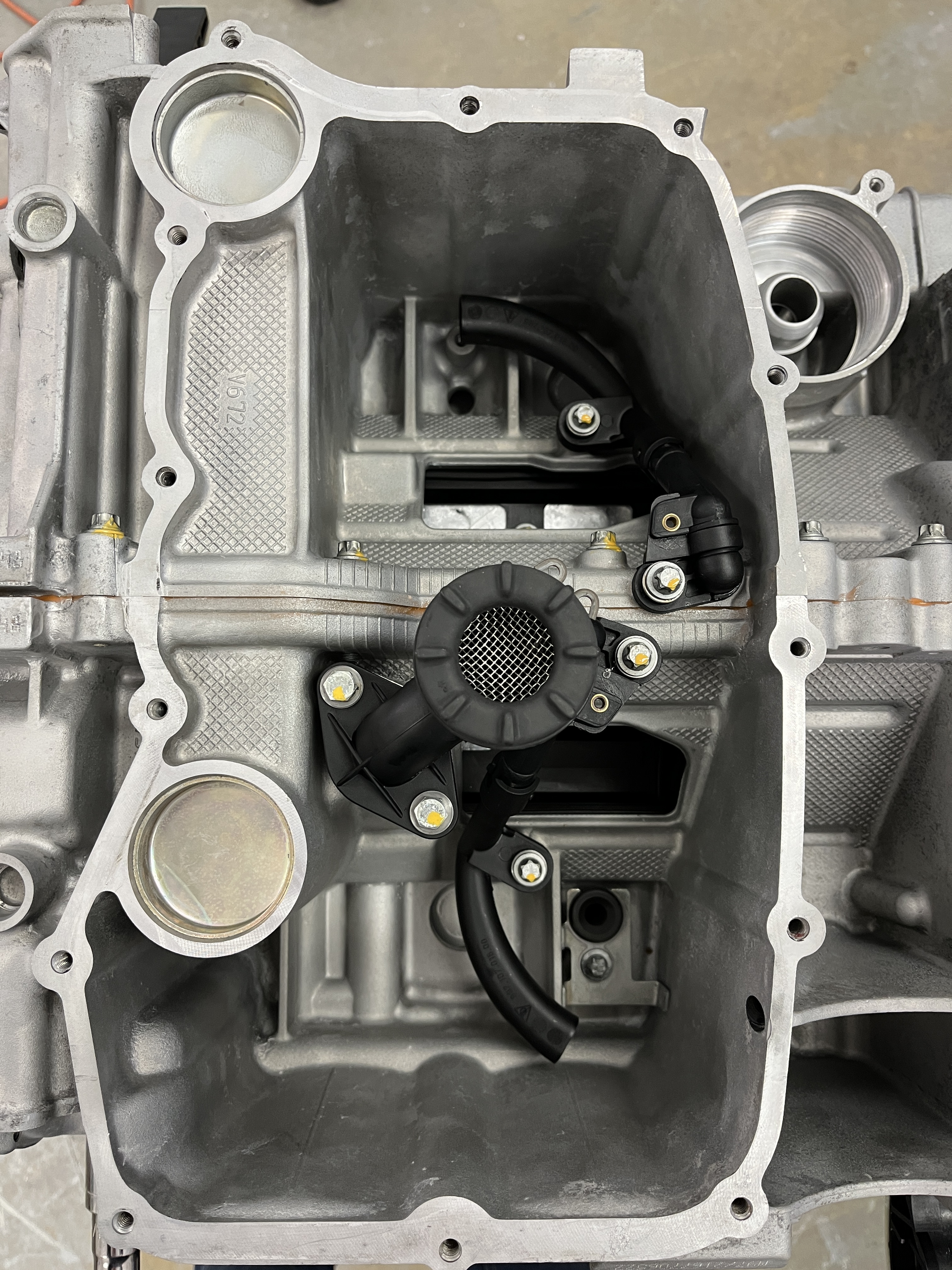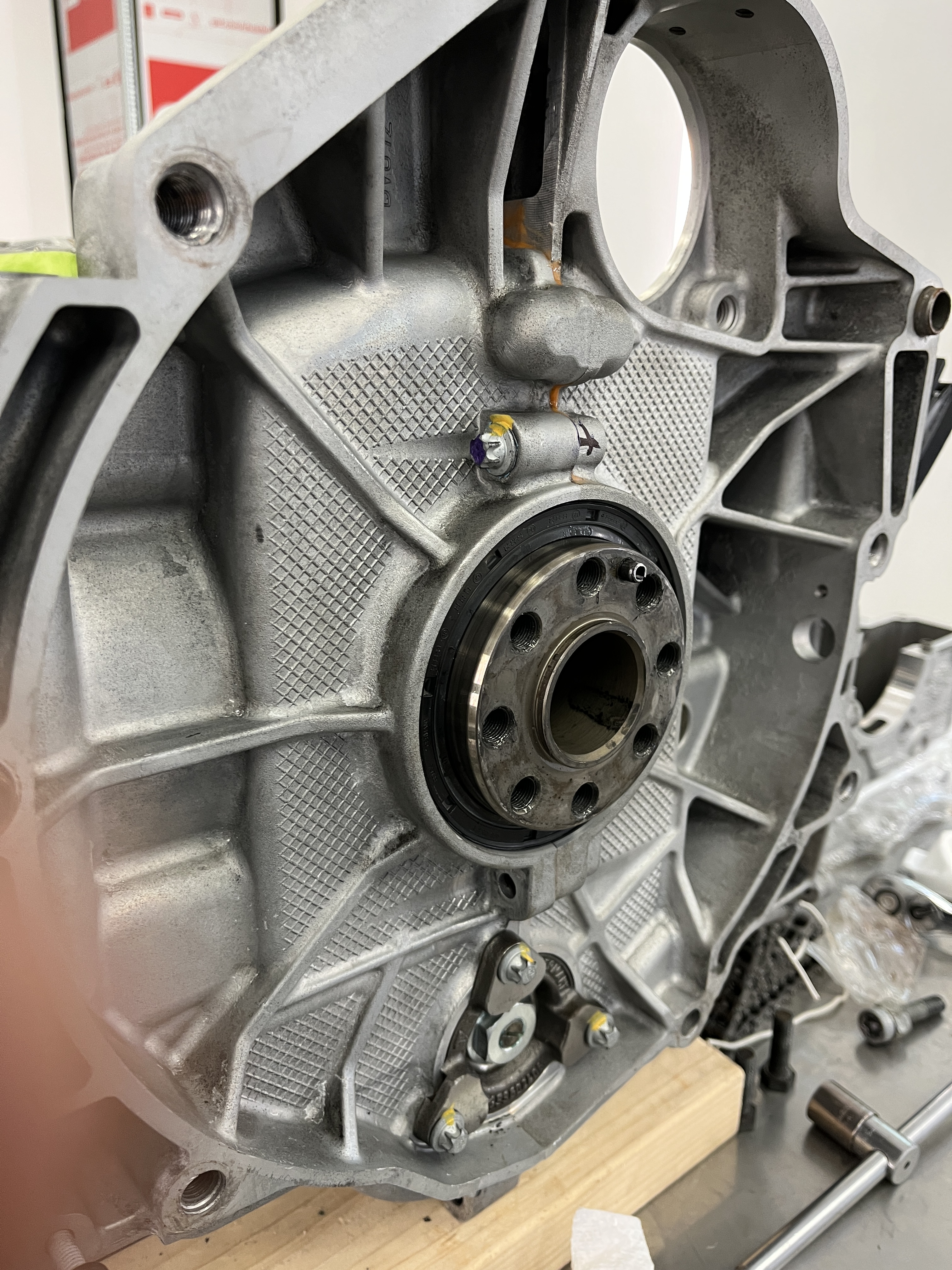 - Loctite 574 for the crankshaft carrier. OK, this is a little bit of a sleeper issue. If you watched my video on the oiling system, then you are a certified Engine Nerd! If you can recall, the crankcase half is a machined fit to surfaces on the crankshaft carrier, with oil passages trapped between the two surfaces. There is a similar arrangement on the 944, where the crankshaft girdle has the oil passage from the pickup tube to the suction of the oil pump. On the 944, the factory seals this interface with Loctite 574. Per the Loctite literature “LOCTITE® 574 seals close-fitting joints between rigid metal faces and flanges. The product cures when confined in the absence of air between close-fitting metal surfaces.” With all the angst about oil pressure on the Cayman, it seemed like a no brainer to seal this interface. Brandon at SRD confirmed that Hartech does the same on their rebuilds and that SRD is doing the same.