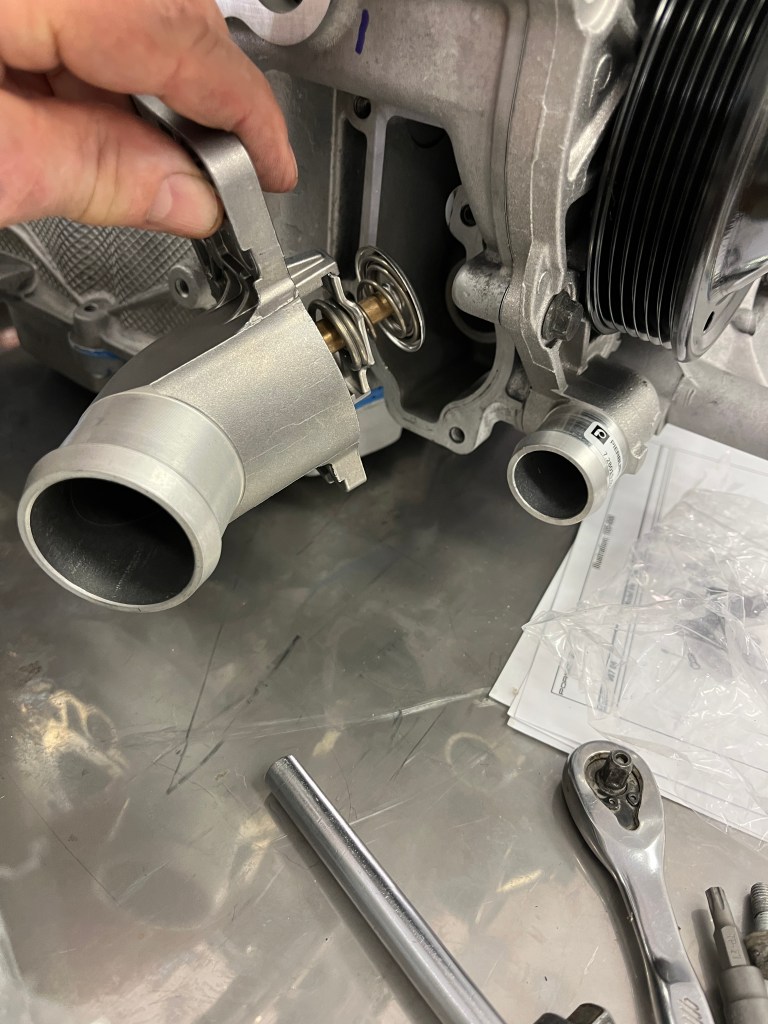 - Installing the front and rear components. As Jake describes, after the bank 2 pistons are installed it is a good time to install the front and rear mainshaft seals, the IMS front bearing retainer, the rear IMS/oil pump console, the water distribution console, the water pump, and the thermostat. The large PTFE rear mainshaft seal is a little finicky to insert straight but careful tightening of the tool brings it home. Insert to the 13 mm depth below the flywheel flange as per the shop manual. I used the LN Engineering insertion tool. Once you get it partially installed, you remove the tool and take out the blue plastic protection device, then reinstall the tool and proceed to the 13 mm depth.