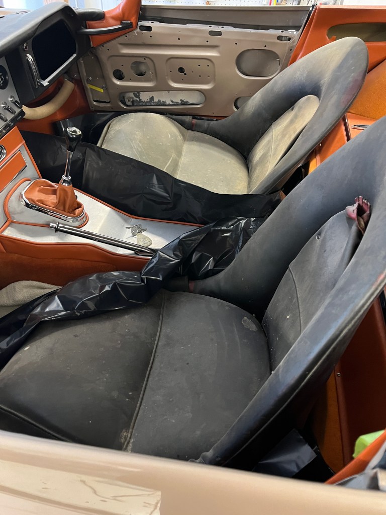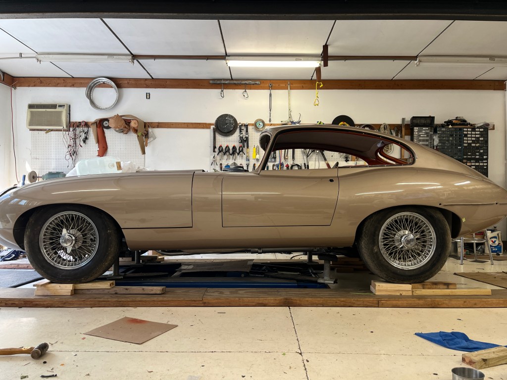 That groaning noise is the lift, not the spirits of Etypes past! One reason I did this was to get an initial impression as to the front torson bar settings. I am reasonably happy with the stance. The front and rear ride heights were set using the dimensions proscribed in the workshop manual. Of course, I need to get some road miles on the car and let the suspension settle. Also, currently the car is shod with Vredestein 185-15 tires. The final assembly will use the period correct 6.40x 15 bias ply tires. These have a slightly larger diameter.
