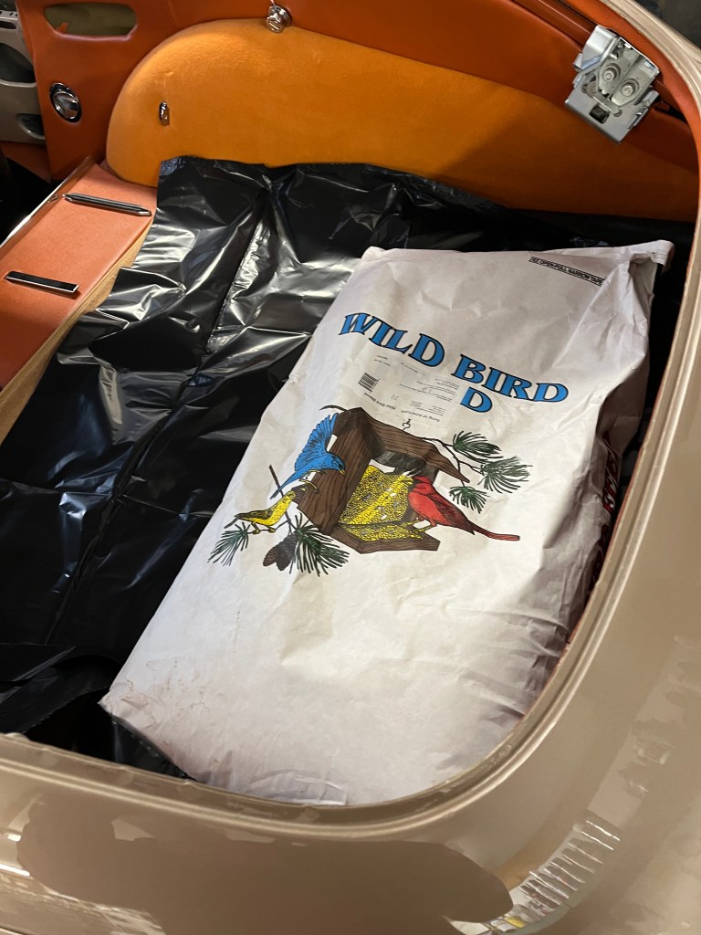 BTW, in order to load up the suspension, I have 5 gallons of coolant i.e. water on the bonnet, a 40 pound bag of wild bird seed in the boot i.e. the fuel, and some random metal plates in the floorboards to represent the 20 pound weight of the windscreen. I checked the vertical dimensions up to the bottom of the wheel arches and got about 23″ front and rear. I measured it again after removing the above items and it measured to about the same values