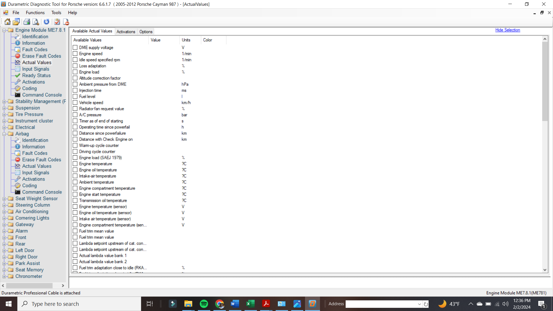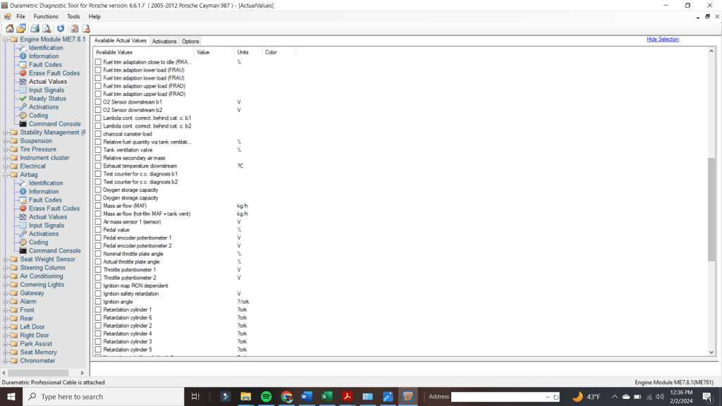 One thing you can do is track Actual Values. The Durametric website does not give a complete accounting of which Actual Values you will be able to look at. So, here goes. For specifically my car and using the Professional version of Durametric , below are screenshots of the Actual Values that you can track in real time. And datalog if you wish. BTW, I just checked their website and it appears that the Enthusiast version should also be able to access these same Actual Values. Also BTW, it took me a while but I clicked on all of the Actual Values just to confirm that values were being reported. Maybe 10% of them reported 0.00, which may be a clever way to say there were no values to report. But in general, I was able to get info for all the parameters shown in the 3 screenshots below. The 4th picture below is just a freeze frame of a typical example of how the data is presented.