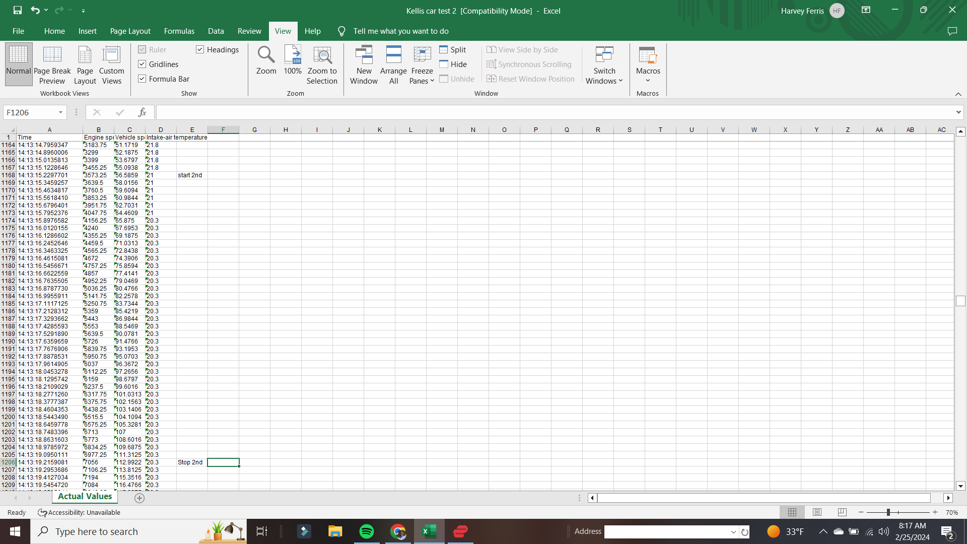 I used my Durametric to “log” time, rpm, vehicle speed, and intake air temp. How to get the data is one area of the Duramentric that was not totally obvious to me initially. I understand the steps now and have made a video, linked below. The output is a .csv file, which is shorthand for comma separated variables. I simply open this file with Excel, scan down to find the cluster of rpm values that go from 3500 to 7000, denote the Start and Stop times, and subtract to get elapsed time. If your car is geared the same as mine, as noted above there are corresponding speeds but rpm is rpm so I like to use that to get the baseline.