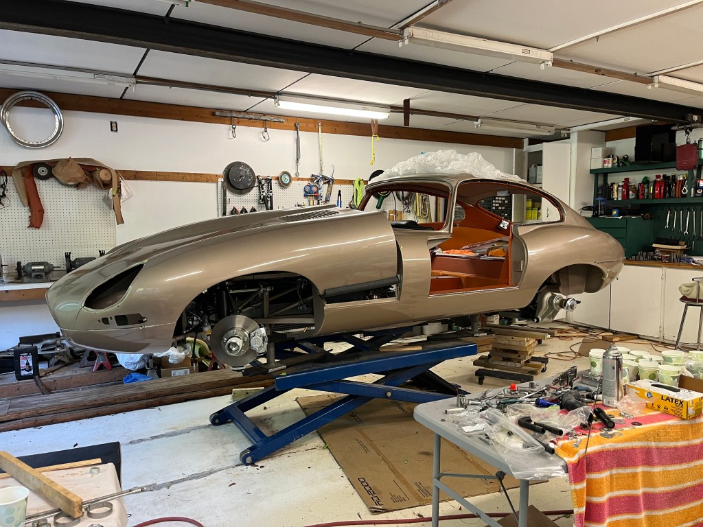 Installation of the IRS went fairly smoothly, in the great scheme of car restoration things. That said, like many others, I had to use some coercion to get all the holes lined up for the various brackets and links that attach the IRS to the body shell. After it is installed in the car, all that remained was to attach the driveshaft, brake lines, and parking brake cable. Another exotic feature of the E-Type IRS is that the disc brake calipers are mounted “in-board” of the rear wheels. This is a racing thing to reduce “unsprung” weight. It may be racy but the end result is that if you have to do much of anything maintenance wise to the rear brakes (beyond bleeding and changing pads) you might have to consider dropping the IRS out of the car to gain access. Like many things, if you do it few times, you probably get better at it!