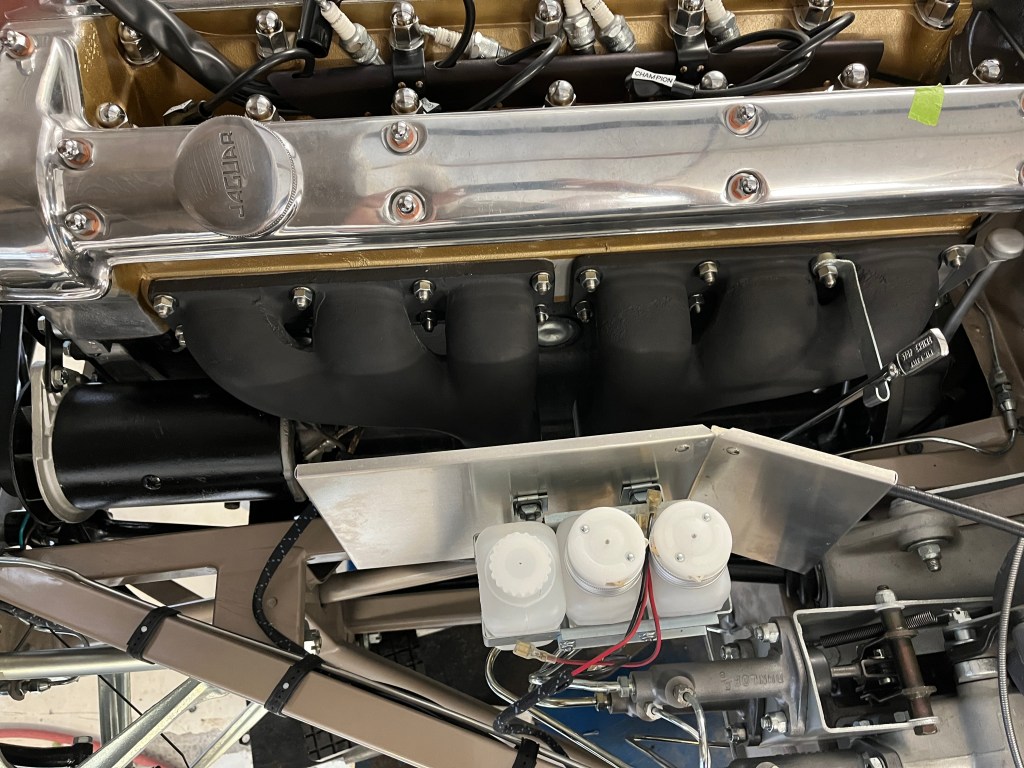 One thing I could do was install the exhaust. Besides the pretty pictures below, I would note that I went with an exhaust system fabricated from “mild steel” tubing. I used a full stainless system on my previous restoration of a 1967 Etype 2+2. I had to agree with others that it sounded a little tinny. I haven’t had a chance to fire up the engine yet but I am hoping I will obtain a more classic sound. I also installed used exhaust manifolds. I want to get all the break-in and carb tuning work complete before I install my fancy porcelain exhaust manifolds.