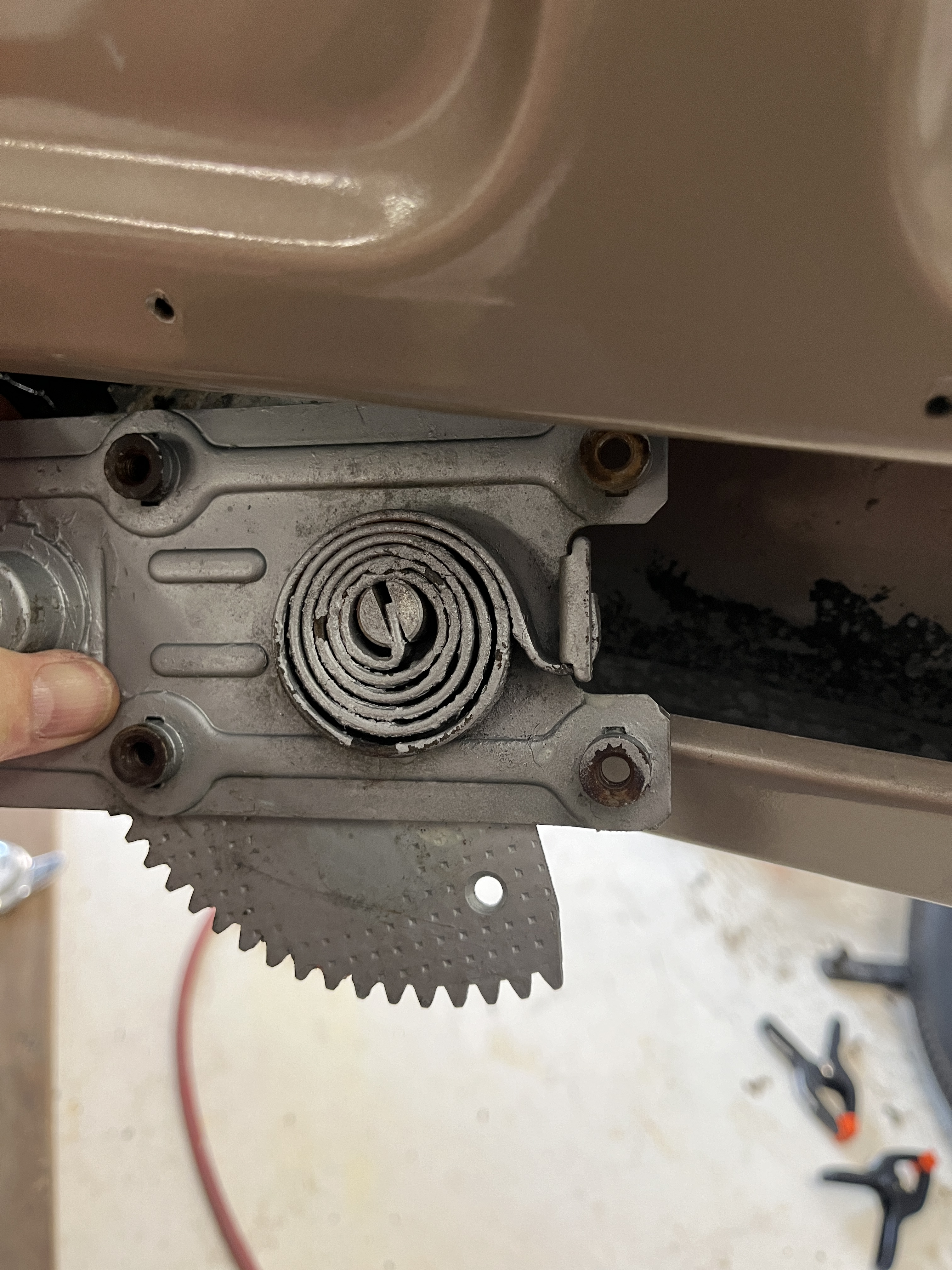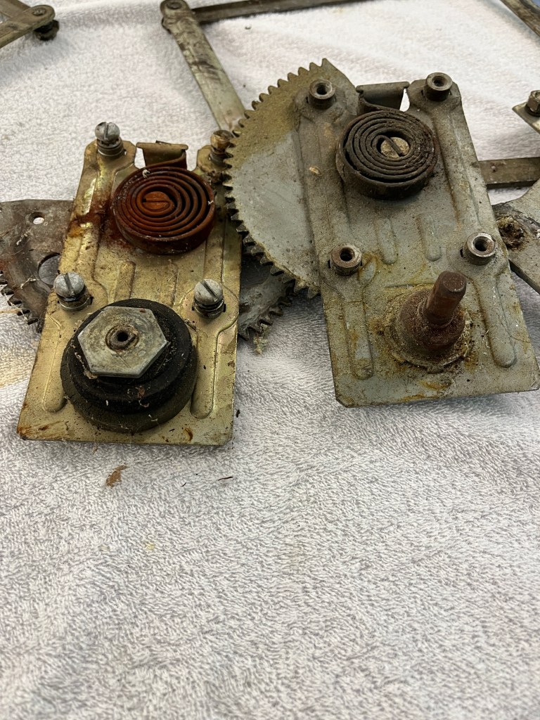 WINDOW REGULATOR MECHANISM- At this point, the door body is mostly stripped of components. The regulator mechanism is attached at two locations. Where the post extends through for the handle, there are 4 obvious screws that must be removed. In the middle of the door, there are four nuts that must be removed. At this point, you should be able to push the mechanism inward, releasing it inside the door cavity. Getting it out is a little bit of a “ship in the bottle” problem. I took a series of photos when I installed it to show one possible path for insertion/removal, which are included below in the photo section. This mechanism was probably not designed for 60 years of use and yours may be a little wobbly at this point. You can certainly clean it with degreaser and add new lubricant to the moving parts. “Fixing it” is problematic. It was not designed for disassembly, as it uses swaged connections instead of traditional threads and nuts. I did have a problem with high rotational resistance at the center pivot, where there is a small plate with 4 studs. I drilled out the swage and went back with a bolt and a nut, so I could adjust the tension. But at the end of the day, if yours is in bad shape, you may just want to bite the bullet and order one of the new reproductions that SNG sells.