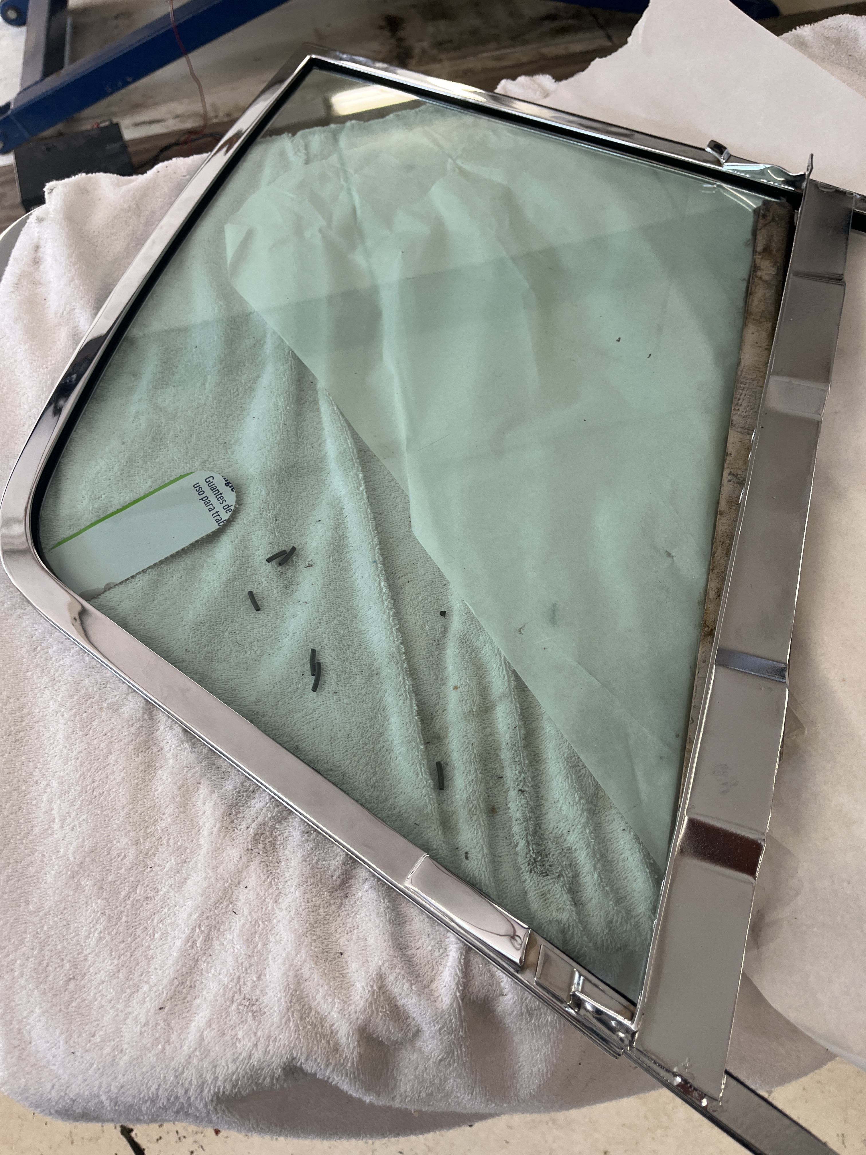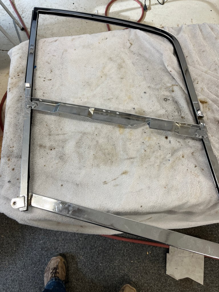 RELEASING THE CHROME FRAME- On the FHC (and maybe on the OTS), once you pull the cap, you will find various screws that pass through a horizontal section of the frame and engage the top of the door inner structure. Carefully note which hardware you are removing to aide in later re-assembly. At the very bottom of the frame, there are two bolts that attach to angle brackets. These are adjustable in the sense that you can push the bottom of the frame inward and outward, with a corresponding opposite movement at the top. This allows some adjustment of the fitment of the door frame at the top, under the drip rail. Get all this hardware removed and you “should” be able to lift the door frame up and out. Warning- it will probably be tight and it will fight you. I removed the glass with the frame. I see no way that the frame can be removed while leaving the glass in the door! You can certainly get the frame most of the way out but that last few inches require that the frame be rotated and twisted substantially so that the bottom of the frame can clear the opening in the top of the door. If the glass remains attached to the mechanism, you can’t articulate the frame as required. I have linked a short video below showing how I install the frame.