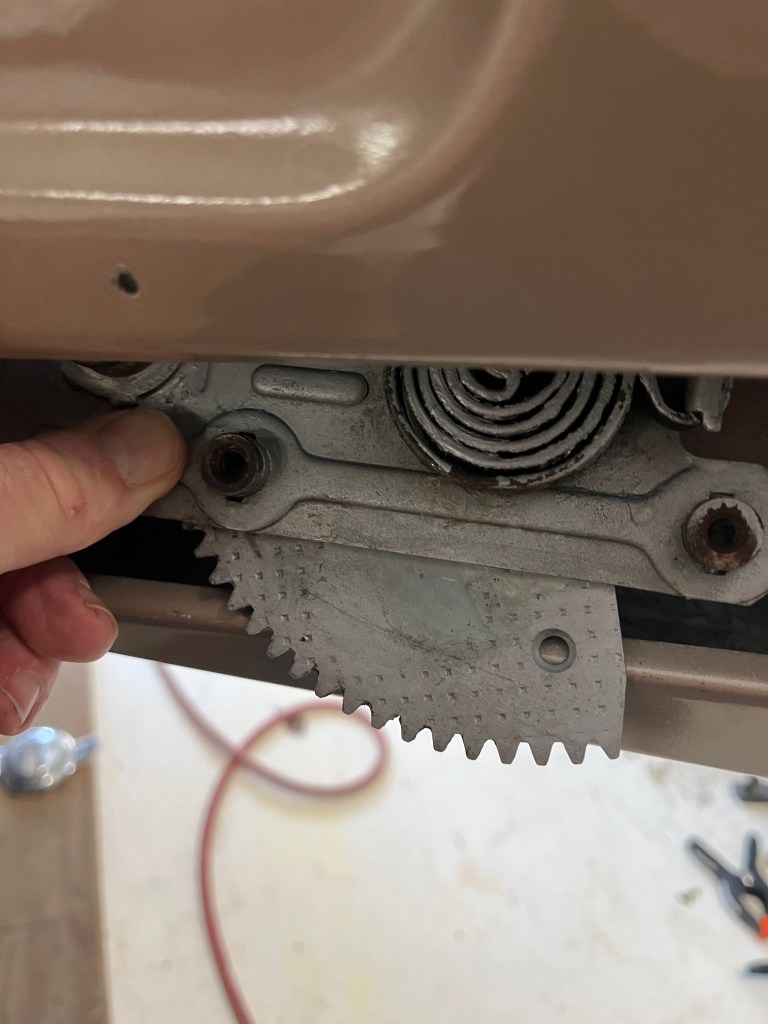 -Install the window regulator mechanism. Do a quick check, temporarily installing the inside handle, to make sure it cranks up and down smoothly. Trust me, it will get worse as you add the glass to the equation but at least make sure that there is no binding without the glass involved.