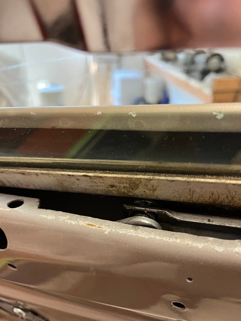 WINDOW GLASS AND FRAME- OK, this is where it gets interesting. For various reasons, you may want to remove the window glass frame and the glass. The sequence is different for the coupe versus the OTS. On both, the “cap” on the door must be removed. At the bottom of the glass, there is a horizontal metal track that is held onto the glass with mastic. This track accepts two rollers on the top of the window regulator mechanism. The regulator mechanism is a parallelogram. As it goes up and down the two rollers move horizontally in the track. To disengage the rollers from the track, you need to raise the window fully vertical and then go another inch or so. When you do this, the rollers will pop out of the end of the track and release themselves. On the OTS, although I haven’t done it, the shop manual says just roll the window up, get the rollers to release, and remove the glass. On the FHC, you first have to release the chrome frame. Once you release it, you pull it up at least an inch, which allows the glass to extend high enough to release from the rollers.