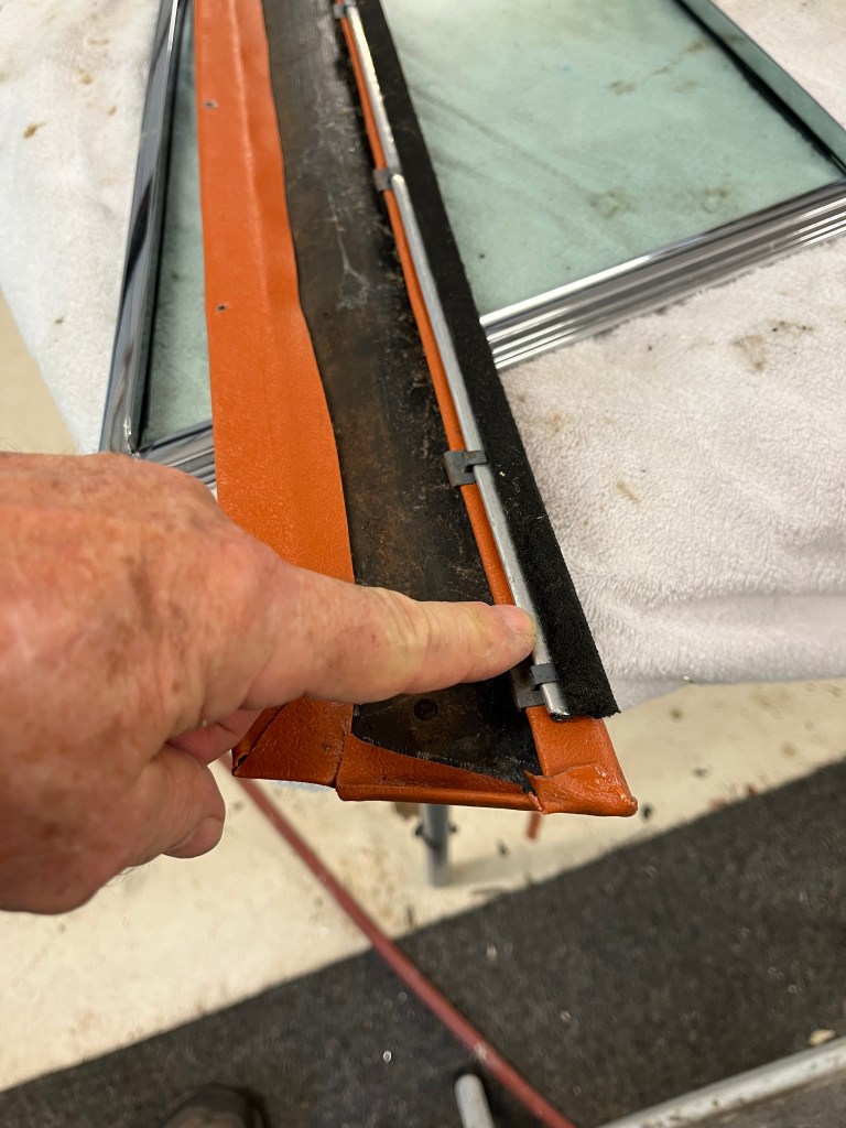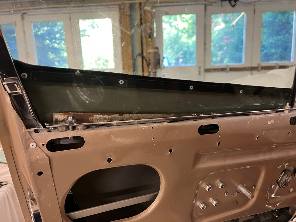 OUTER GLASS WIPE- This is basically a squeegee that seals against the glass and wipes the water off as you lower the window. After 60 years, it may need replacement. Be prepared for different types and be prepared that you can’t really buy the original type that you may find on your car. On mine, I had to drill holes in the squeegee strip and the inner sheet metal of the door, to allow attachment with pop rivets. Since my door didn’t have holes, I am sure the original wasn’t attached this way but the use of pop rivets was required based on the replacement sent to me by SNG.