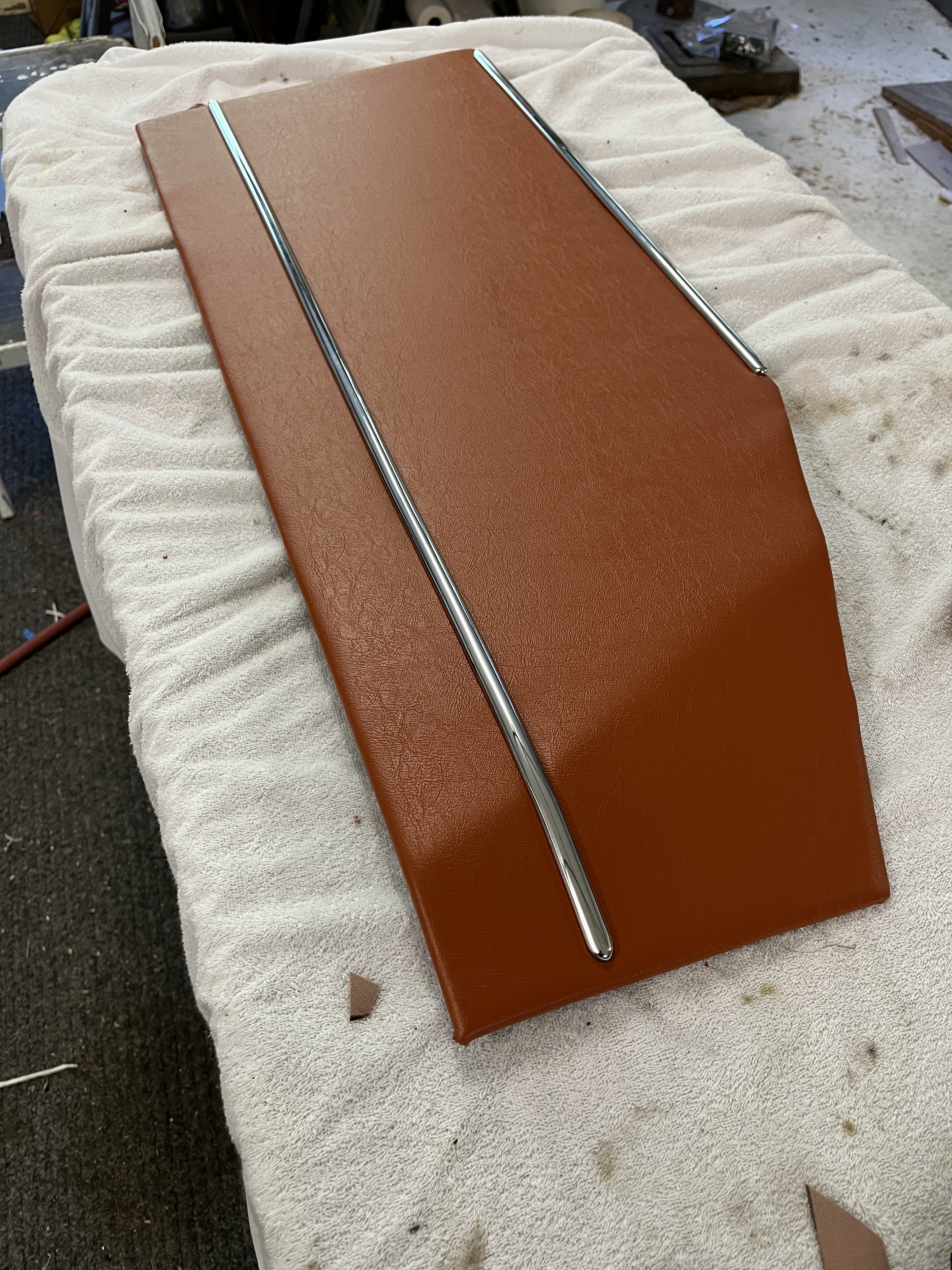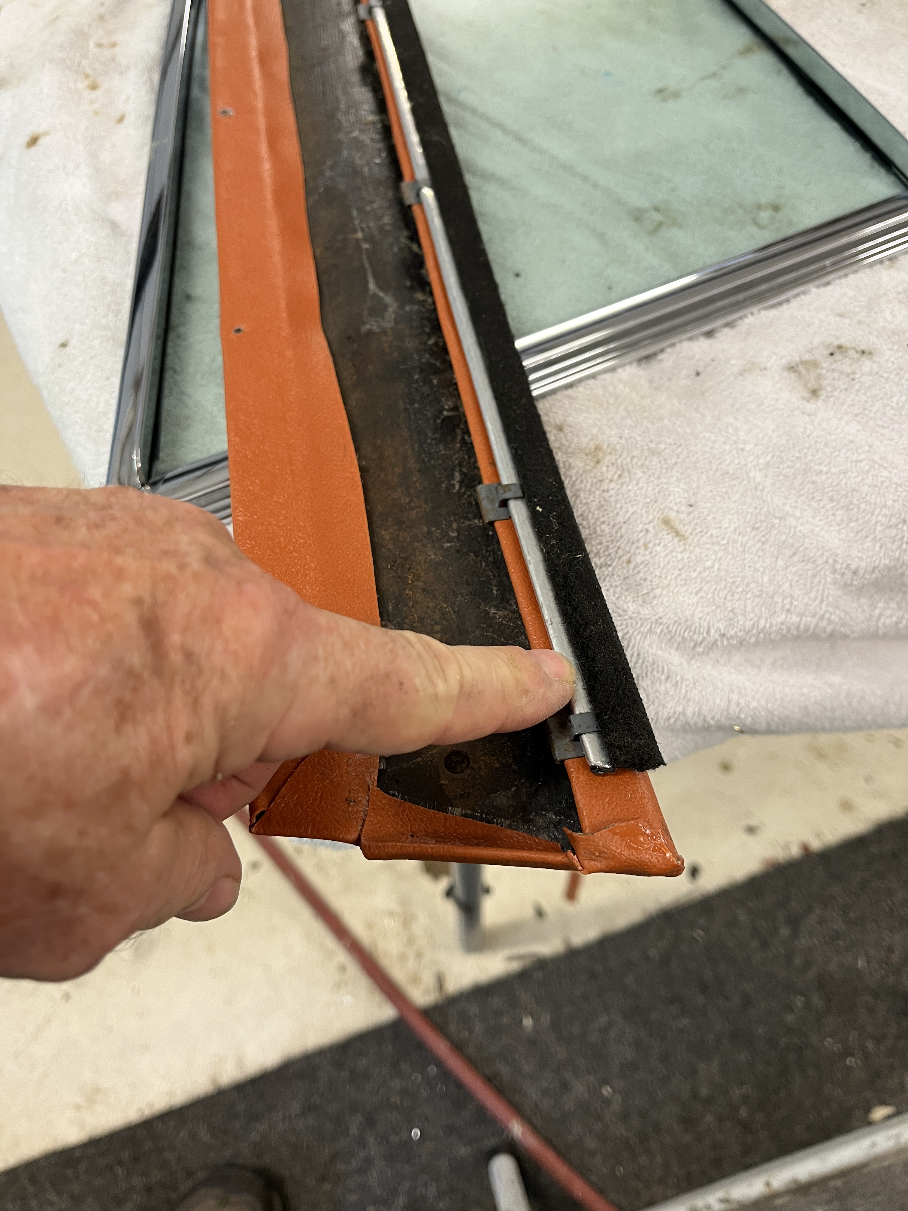 DOOR FRAME FELT- There is a felt product in the chrome door frame. I had my door frames chromed and replaced the felt. SNG sold me a roll of felt. In general, the felt is a little wider than you need. As you push the flat width of the felt (about 2″) into the groove of the frame, it will form a U shape. I notched the one 90 degree corner, put in a light amount of rubber gasket adhesive in the groove, pressed in the felt, and provisionally installed the window glass to compress and shape the felt. After a bit, I used a razor blade to trim the felt. SNG also sells a pre-formed product, which I found out about after the fact.