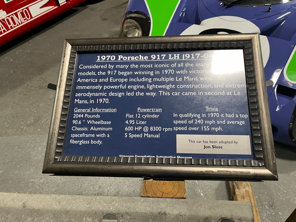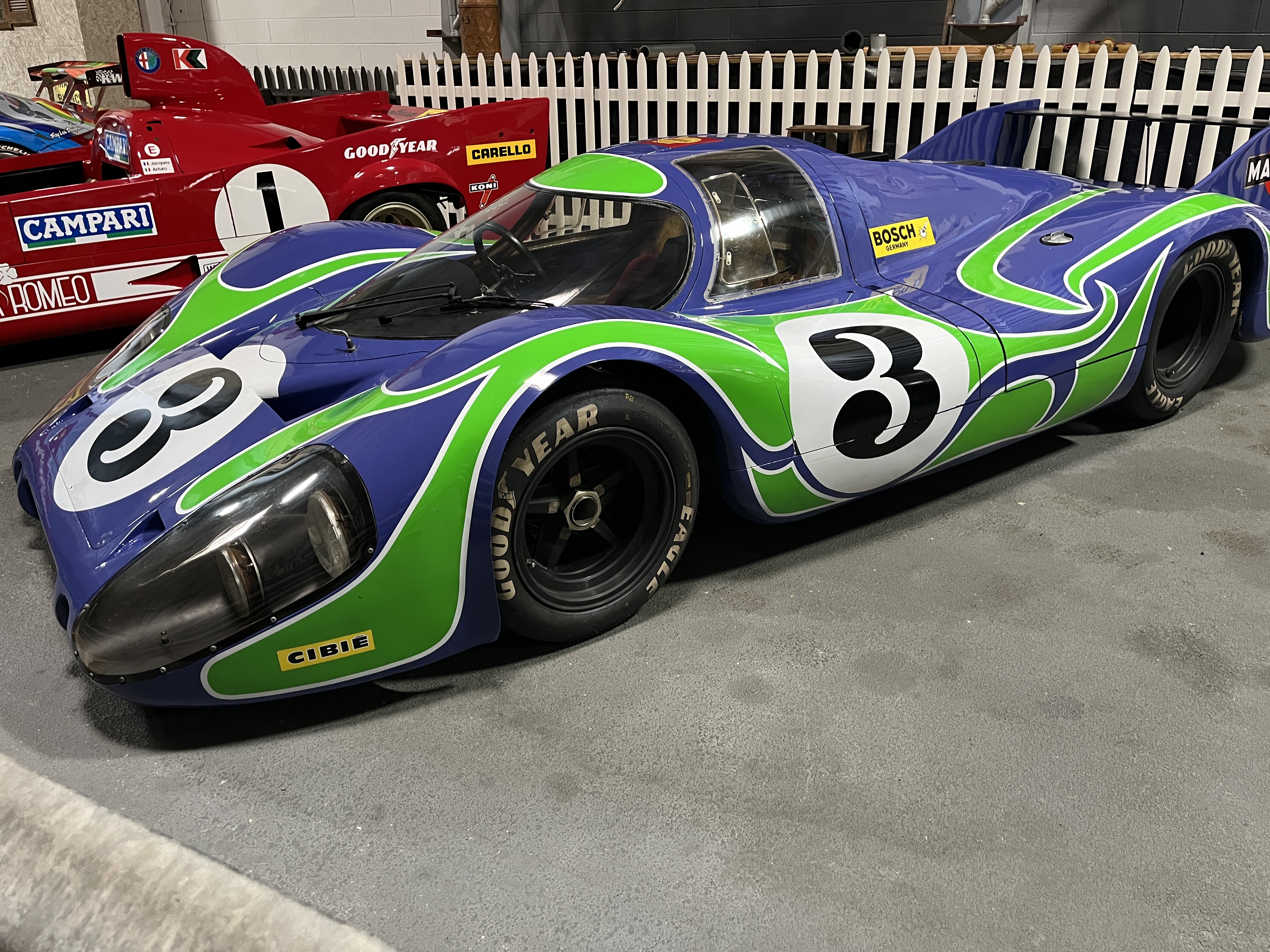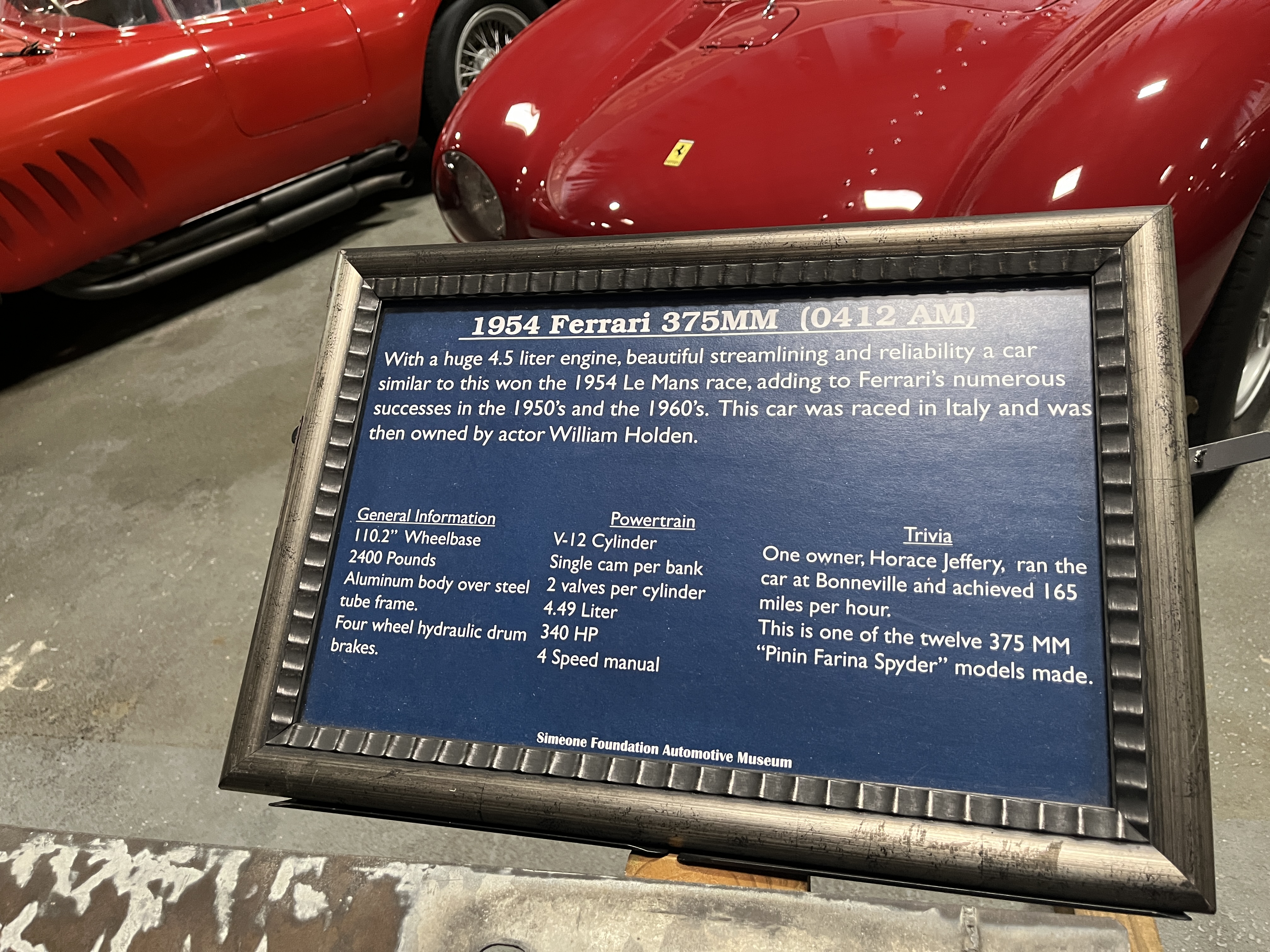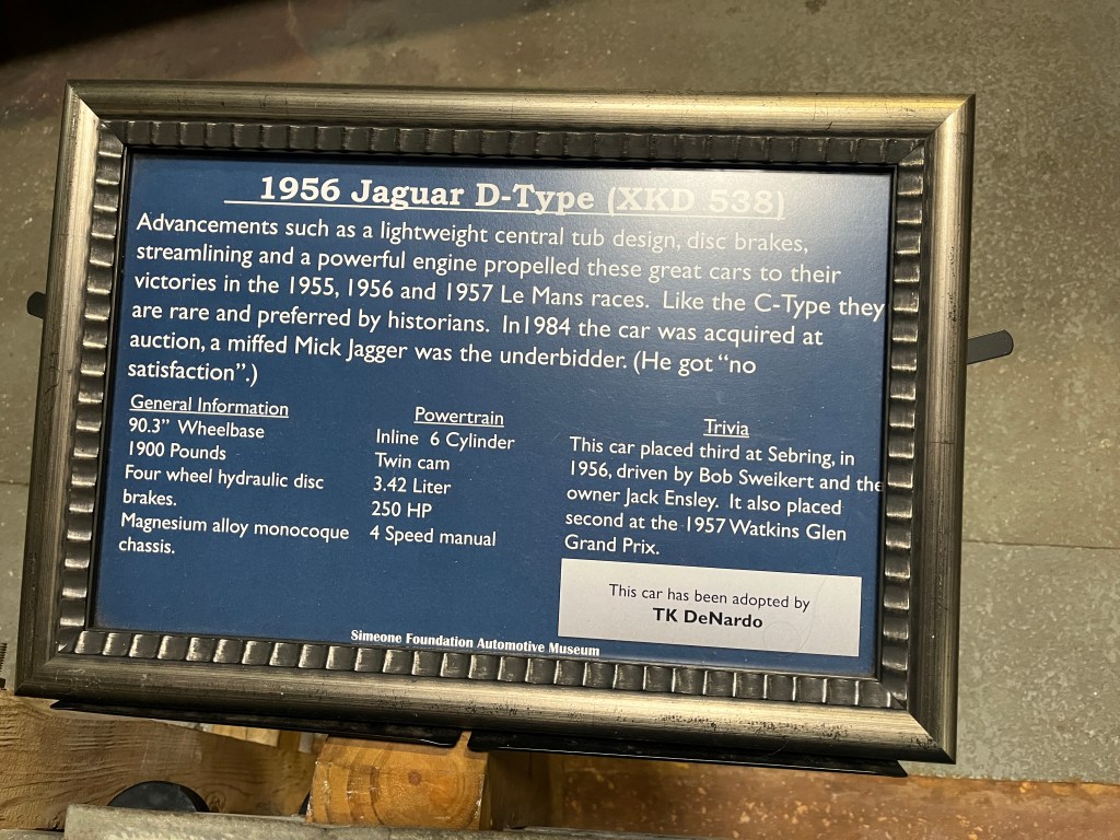 On my way back from a family reunion near Montreal, I took the time to stop in Philadelphia at the Simeone Museum. From their literature: “Founded in 2008 by the legendary neurosurgeon and car collector Dr. Frederick Simeone … whose mission is to educate the public on the beneficial effects of the Spirit of Competition.” As explained to me by one of the docents, Dr. Simeone tended to collect sports cars that were raced in period. The collection is extensive with over 60 cars presented. Their website Simeonemuseum.org provides the entire list. Noteworthy to me were a 1952 Jaguar C-Type, a 1956 Jaguar D-Type, a 1954 Ferrari 375 Mille Miglia, a 1959 Ferrari 250 Testa Rossa, a one of six 1964 Shelby Cobra Daytona Coupe, and the 1970 Porsche 917 “Hippie Car”. About 25% of the collection is non-raced street cars from before WWII. Think marques such are Bentley, Stutz, Dusenburg, Bugatti, Alfa Romeo, Delahaye, and Auburn.