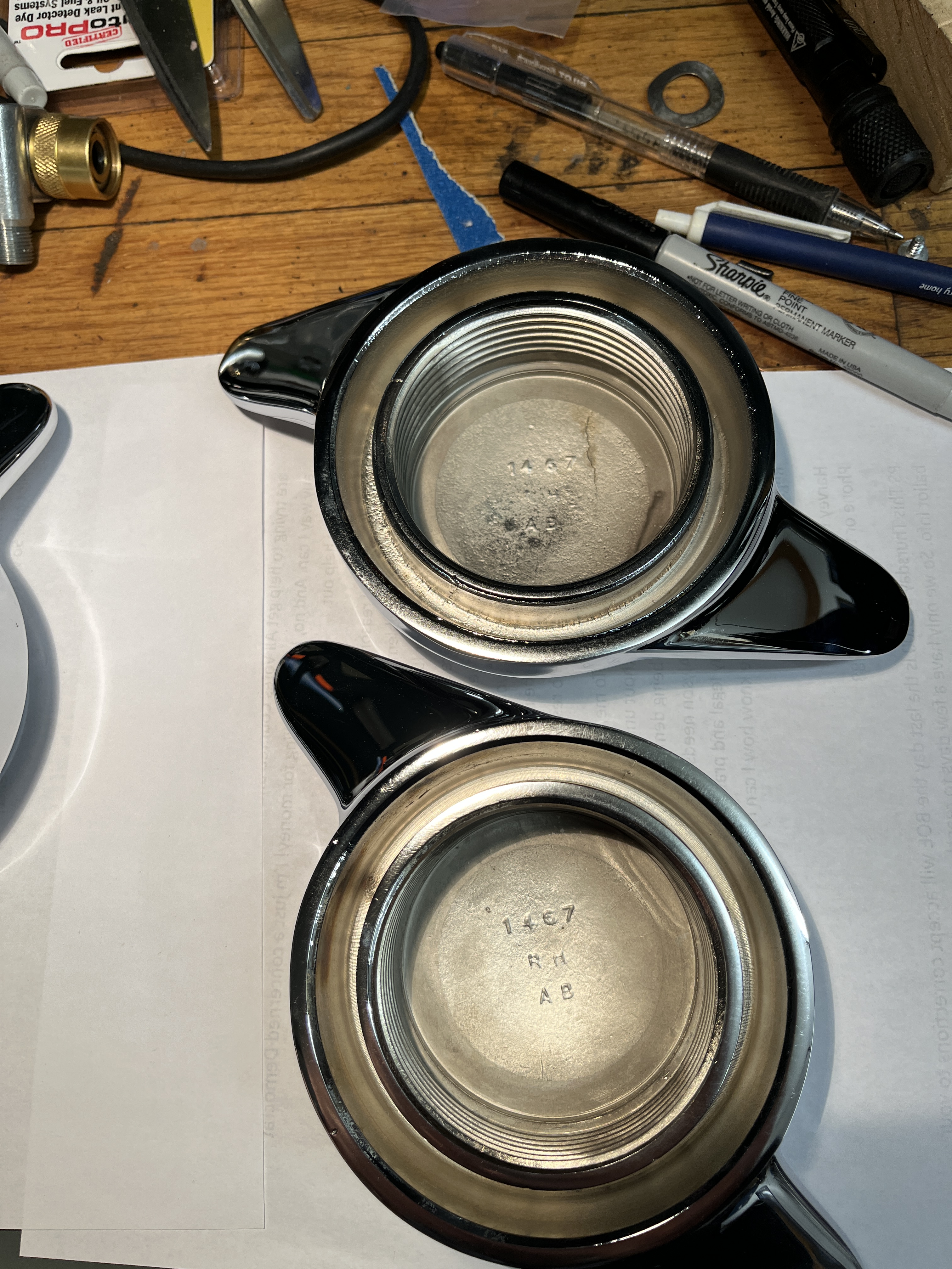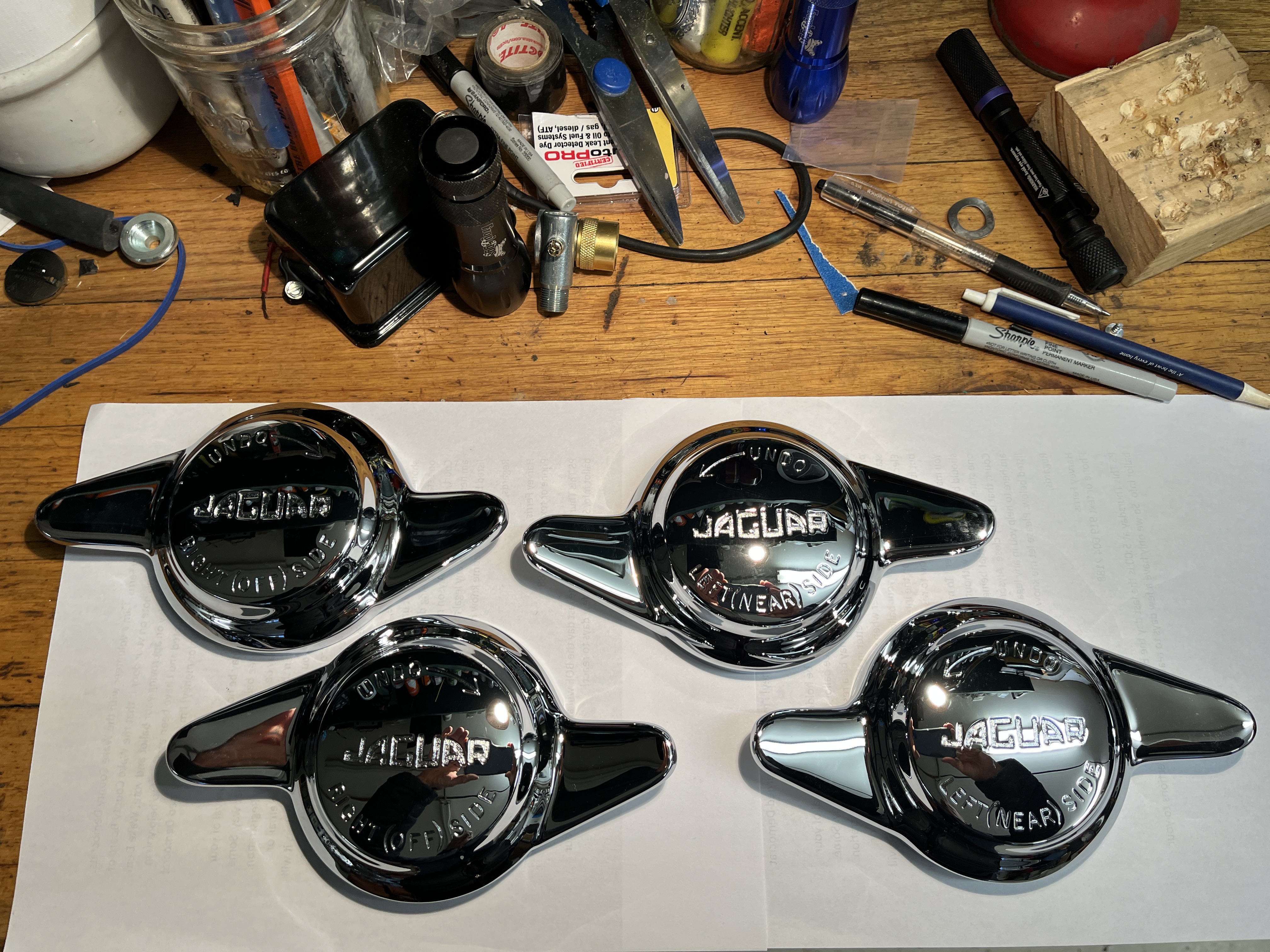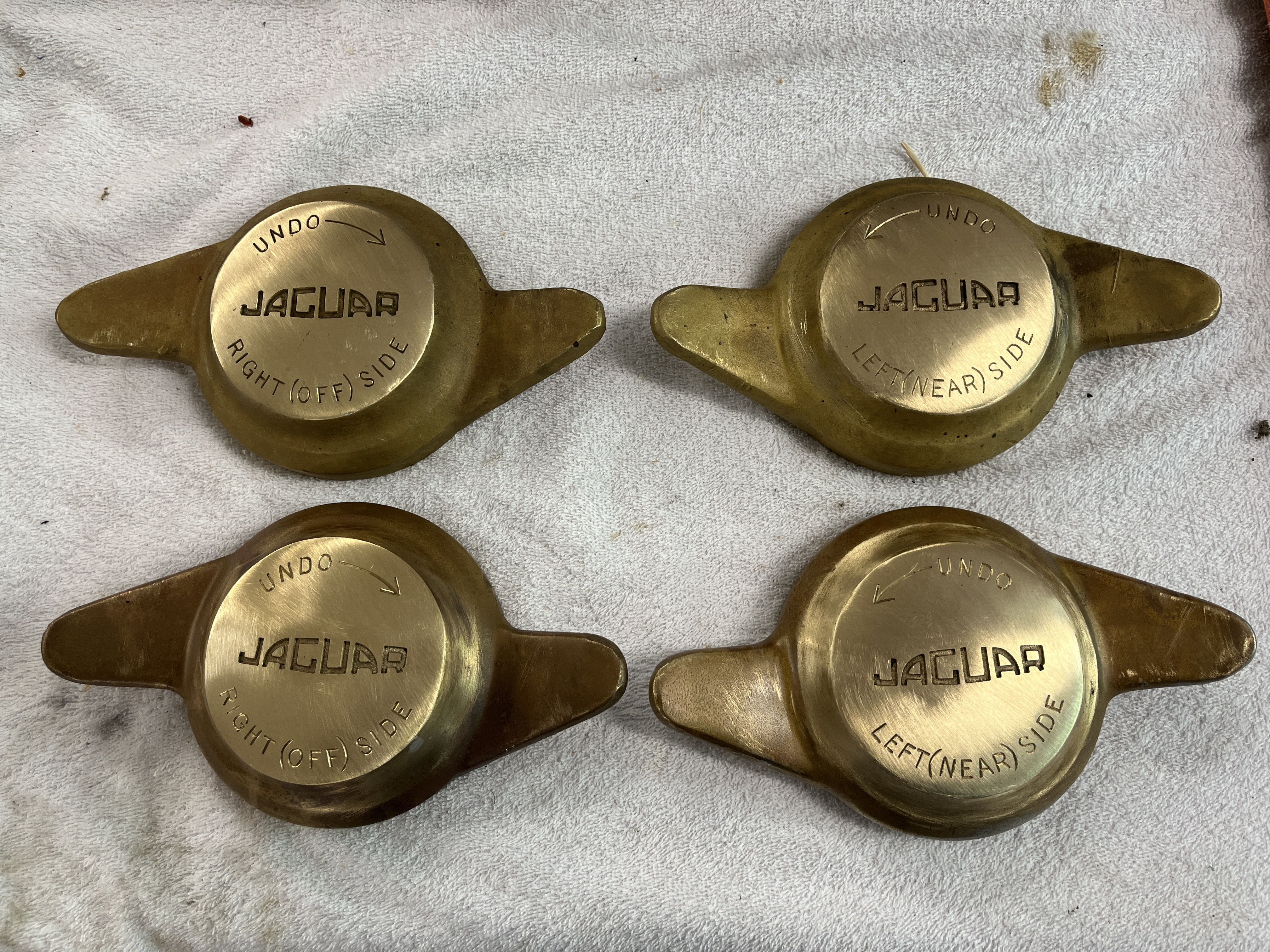 One of my first surprises was to find that when you looking for these devices in the Jaguar Spare Parts Catalog (SPC) they are called “hub caps”. Of course, this made no sense to me, being raised around American cars where a hub cap was metal disk that went over the center part of the road wheel and hid the lug nuts. But for me, I think of them as knock-offs because you have to remove them by knocking them off using a hammer. And of course, some folks call them Spinners. Maybe in homage to the chariot race in the movie Ben Hur! For my “car in a box”, I found 4 knock-offs that I determined to “probably” be original to the car, based on markings on the back side of each one. More on that below. In my case, I decided to restore the ones I had, for the sake of authenticity and soundness of wheel attachment. BTW I was somewhat shocked to find that you can currently buy reproductions from SNG for about $130 each. I have no idea how they make them for that cost. But as I read resources like the EtypeUK 3.8 Factory Fit forum, I found that the astute observer can spot flaws on the repos. More on that below. So I embarked on getting mine restored.