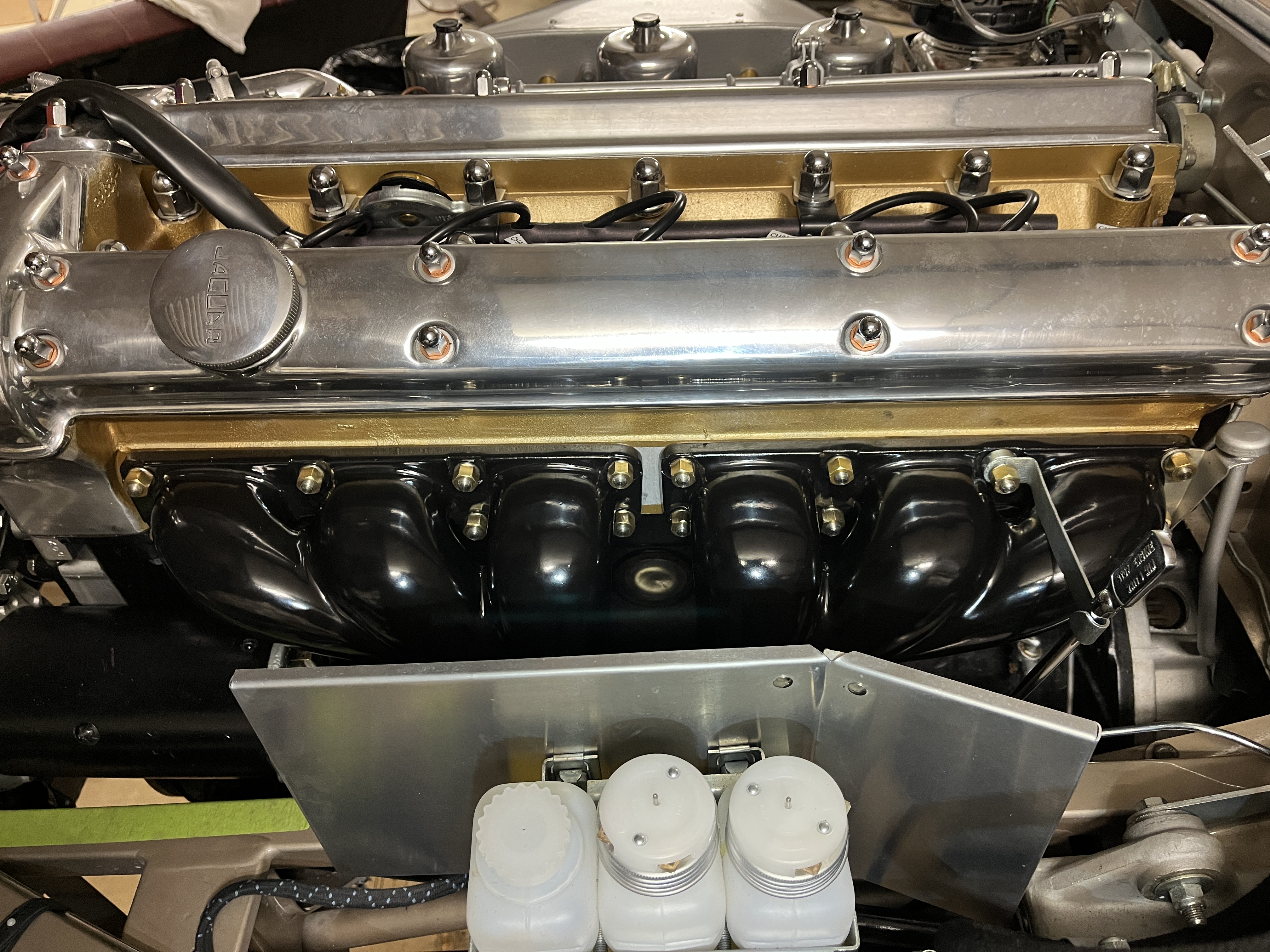 Yet another final item was the installation of the “mud shields” in the engine compartment. I had held off on these because access to work on “stuff” in the engine compartment becomes very restricted with these shields in place. As is typical with this project, the reproduction shields I had to purchase fit pretty well but required some “fettling”. Just figuring out where and how they were attached was a research project. An internet query turned up discussion on fitment on Jag-Lovers, with useful diagrams. Regardless, installation is tricky as you are boxing yourself in as you go. Removing the air filter on one side and the battery on the other side was necessary to allow access.