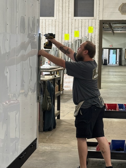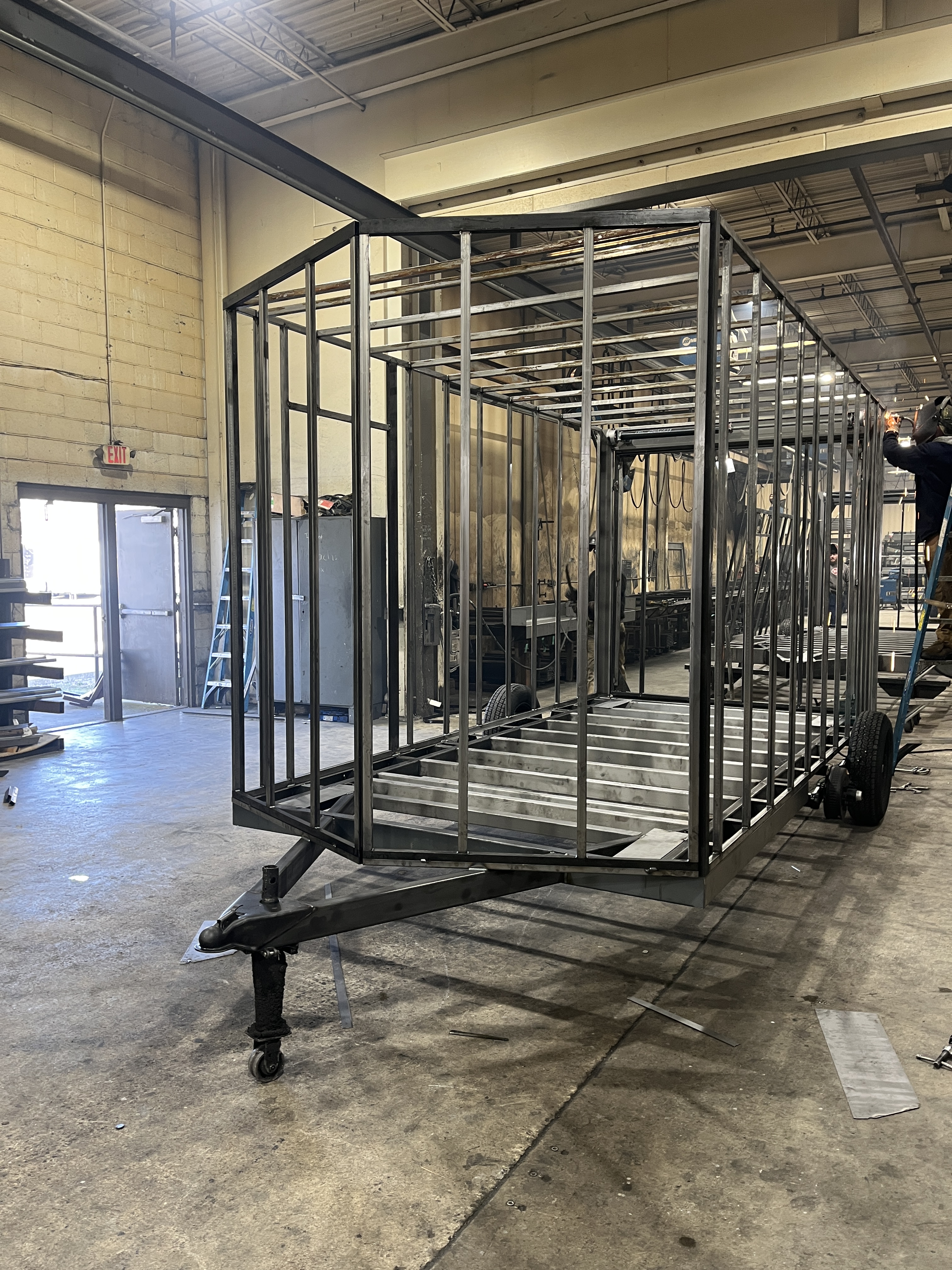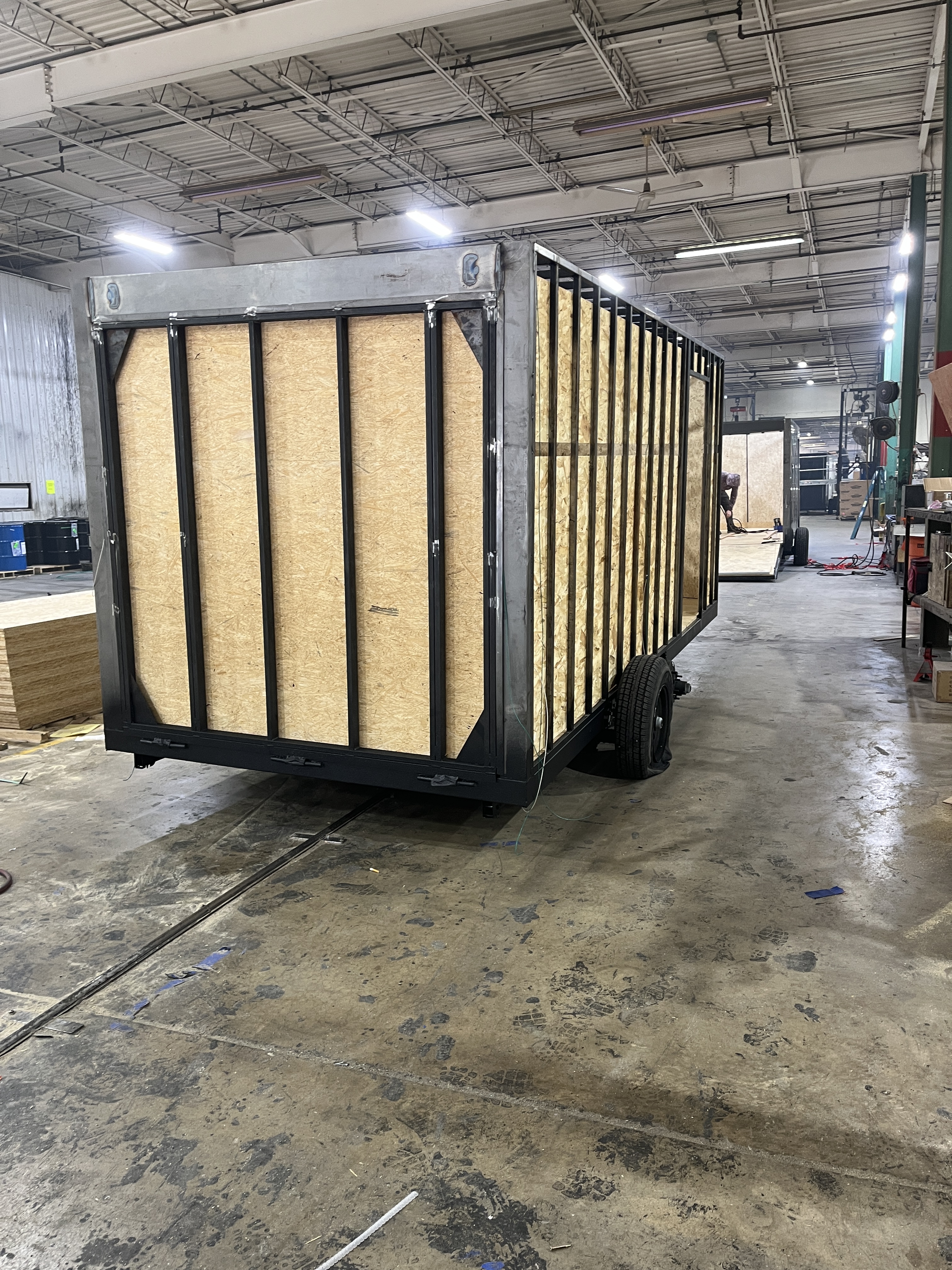 I have included some photos below. In general, the frame of the trailer is all steel construction. The trailer is completely MIG welded by workers at the factory. The metal framework is then painted. After that, the interior is lined with DryMax board and the exterior with aluminum sheet. With the Deluxe package, the roof of the trailer is one continuous sheet of aluminum. The walls are screwed together, although with their Premium package, you can have the wall panels glued with no screws visible. The exterior aluminum comes in a selection of colors. I went with plain white. My trailer is a bare box with 4 D-ring tie downs to attach my towing straps to. But while I was there, I saw some trailers getting much more elaborate interiors and features, such as air conditioning and built in generators.