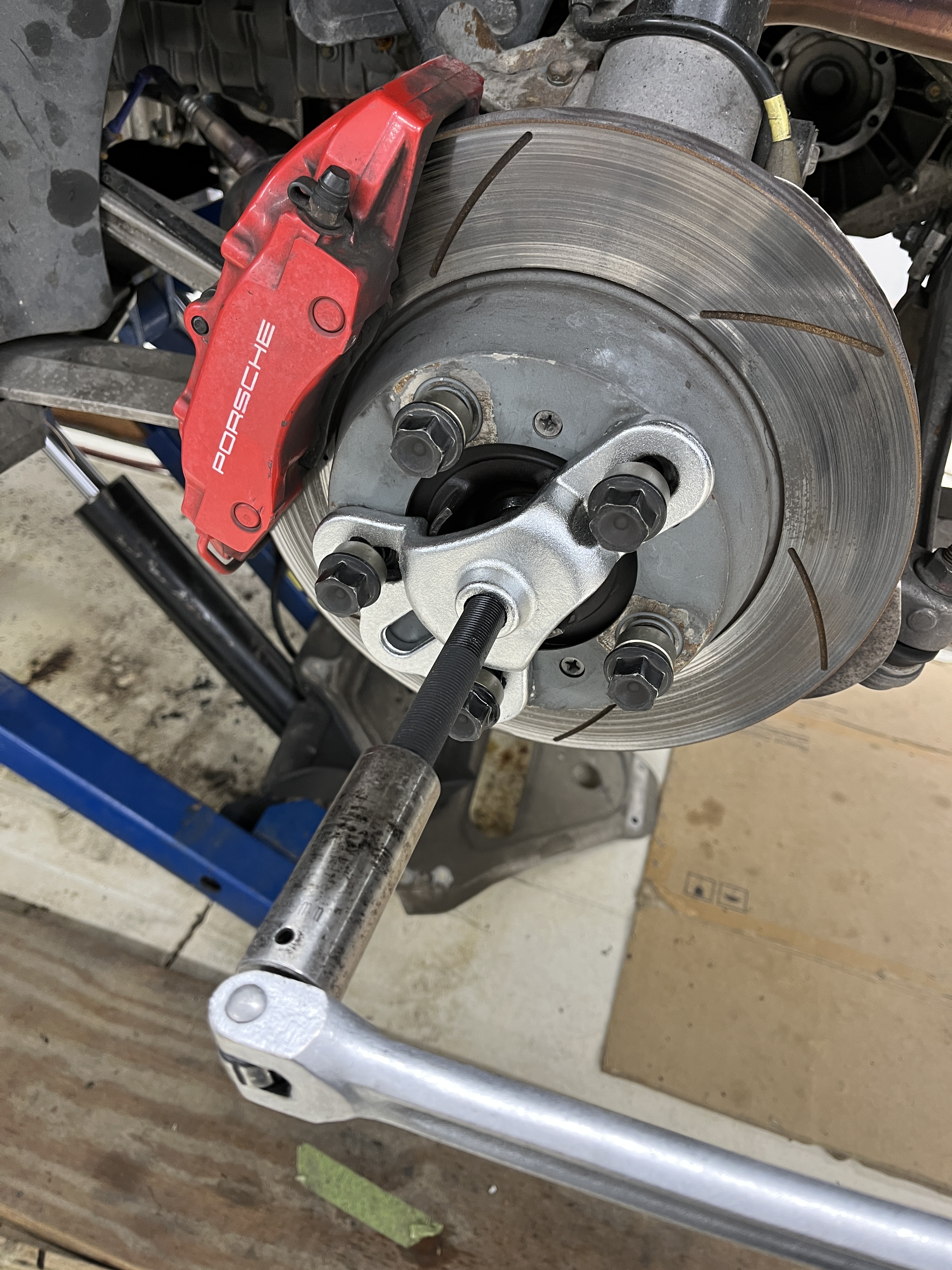 Removal of the M10 internal hex bolts at the transaxle CV joint was straightforward, although I always pucker a little when having to release highly torqued internal hex bolts. Drop that end of the drive shaft so that it dangles below the transaxle. I tried tapping on the end of the splined shaft (with the nut installed) with a hammer but it was pretty firmly stuck. I had a set of puller tools and was fortunate to find one that I could use to drive the splined drive shaft inward and thus release it from the hub. The tool I had did the trick and the splined driveshaft moved inward and released itself.