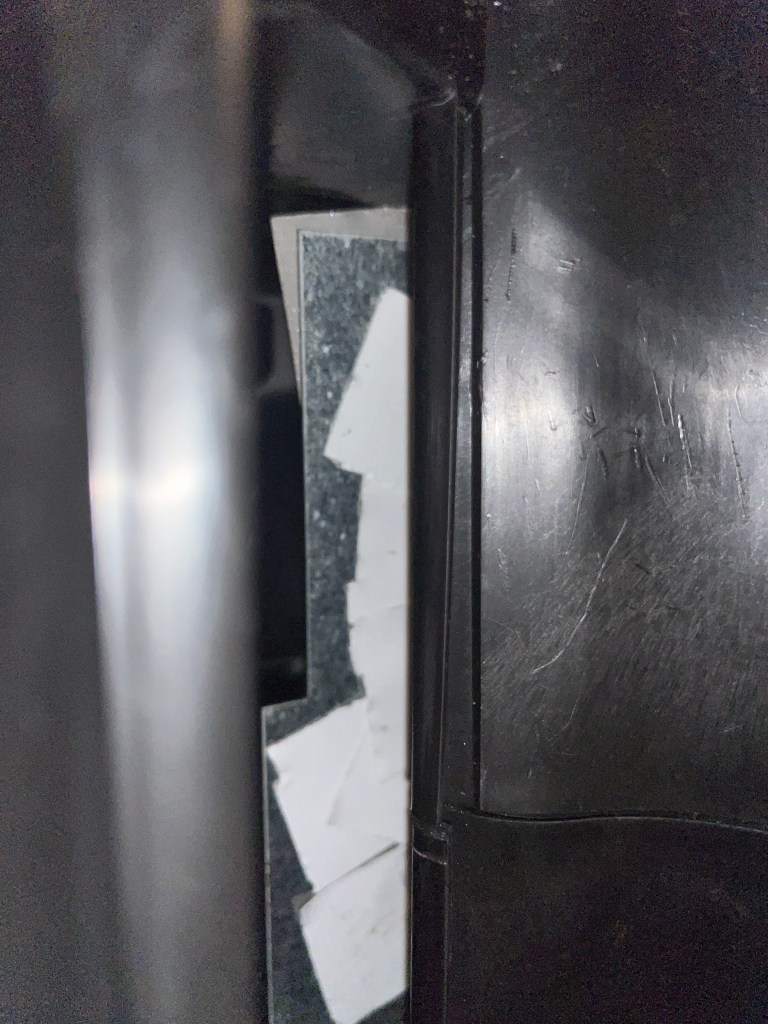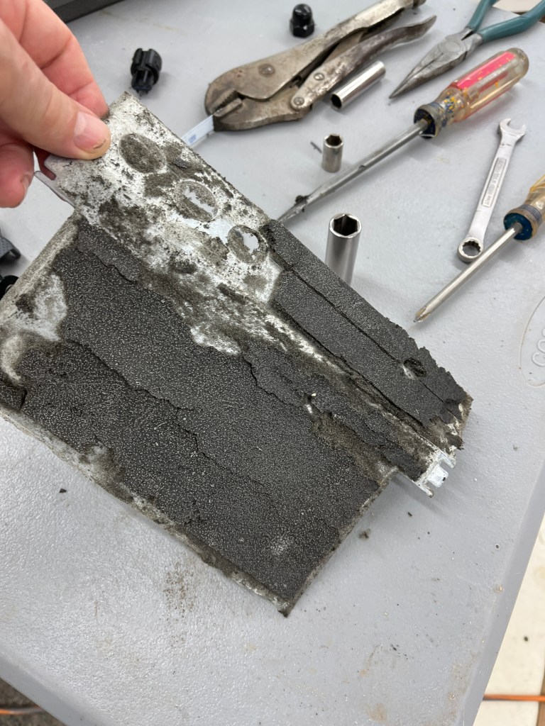 So how do you repair this flap? My arms were certainly too large to reach into the openings and touch it, much less repair it. My secret weapon? One of my neighbors, a 17 year old girl that is quite slender! She was able to reach in there and strip off the degraded foam. I then gave her approximately 2″ squares of duct tape to apply over the holes. All we were trying to do was cover the holes. Fancy repairs that attempt to cover the entire surface of the metal flap were rejected, as I did not want sticky duct tape extending beyond the edges of the flap and gumming up the works, so to speak. We put the duct tape on both sides of the holes. Although duct tape seals OK to the metal, we all know it is tenacious when stuck to itself, sticky side to sticky side. I am pretty sure I don’t want to do this job again and I felt that if we got some adhesion, tape to tape, at the holes, it was going to be good to go for my lifetime.