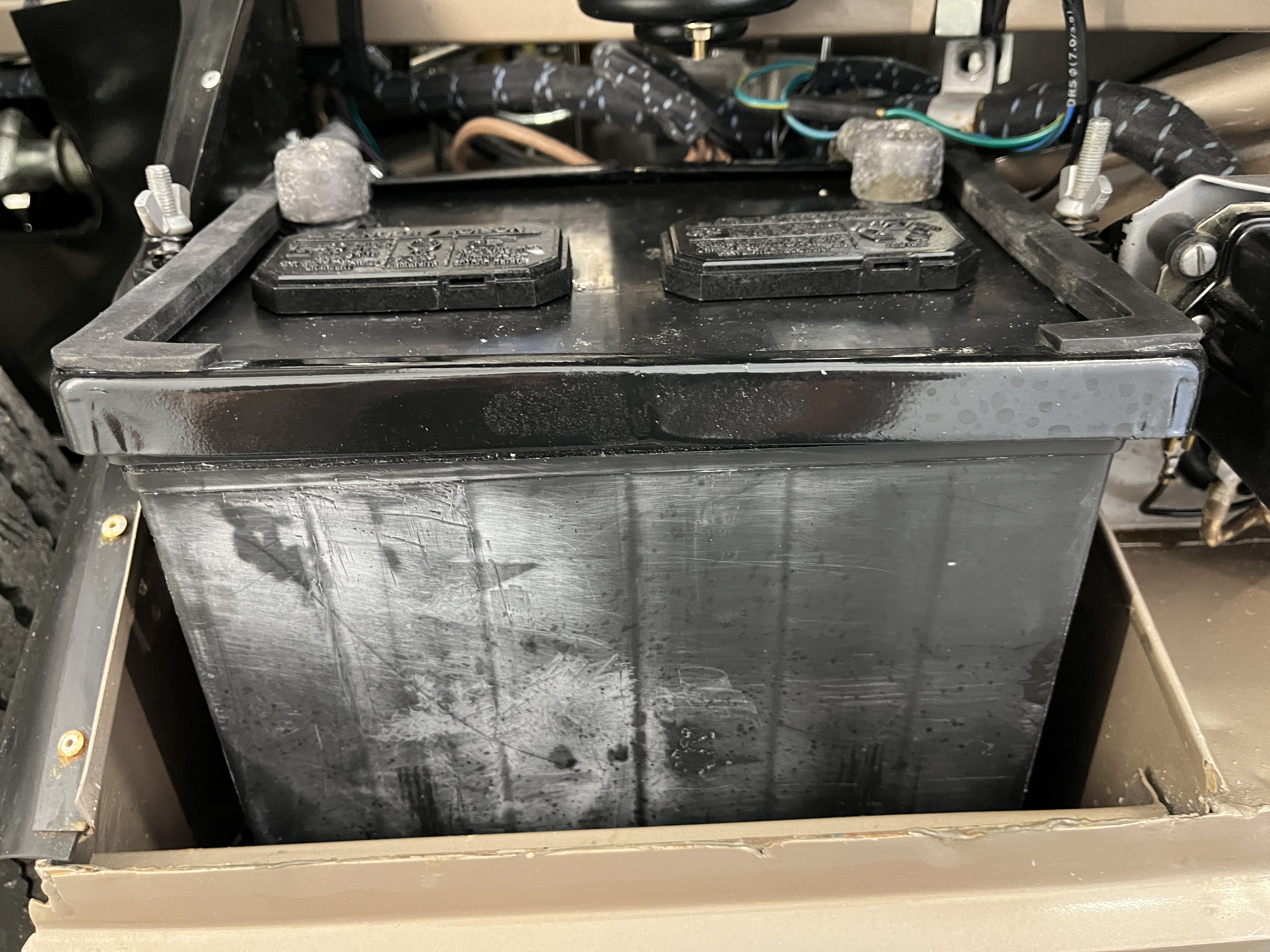I had experienced some electrical “gremlins” with this whole setup before, in that every once in a while, the starter would be balky. Just often enough to be annoying and cause me to carry a supplemental battery jump pack around with me. To digress, these are modern marvels. About the size of a 6″ Subway sandwich, they will give you extra starting boost when you least expect to need it. But I digress! So I wanted a modern battery. Nothing fancy, just a standard lead acid battery. The Interstate battery fit the bill. I removed the stickers and I sprayed the caps with black paint. It is very innocuous and looks perfect. Note that the Factory Fit discussion does not consider the red and gold Lucas stickers as authentic. As noted above, the JCNA rules are silent regarding this issue.